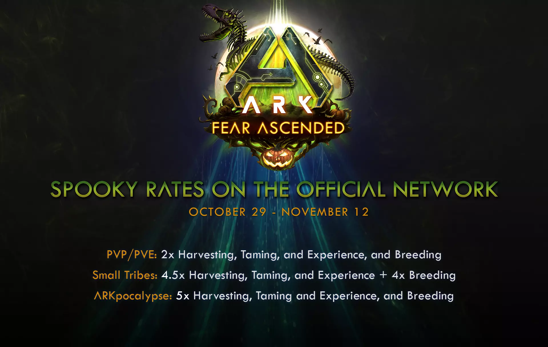 下载完整分辨率版本 黑暗再次笼罩方舟…… “恐惧飞升”活动现已回归,将持续至11月12日。这场令人毛骨悚然的庆典带来了全新皮肤、诡异生物以及诸多惊悚惊喜等你探索。 我们为“恐惧飞升”活动增强了饱和度——更多色彩、更多种类,也有更多机会在野外发现罕见色调。你的世界将变得更加明亮、鲜明,并充满社区最喜爱的一些色彩! 幸存者们,待在篝火旁……你永远不知道黑暗中潜伏着什么。 在此查看所有诡异详情。