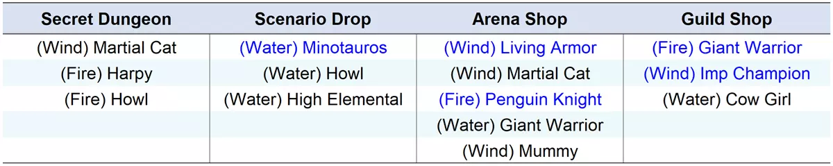 ※ 以下怪物的获取途径将被添加。 - [竞技场商店]:(风属性)活体铠甲、(火属性)企鹅骑士 - [公会商店]:(火属性)巨人战士、(风属性)小恶魔冠军 - 查鲁卡遗迹:(水属性)米诺陶洛斯