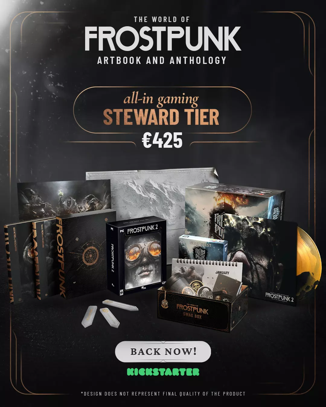 在众筹活动的最后一周,我们还公布了全新的最终承诺档位:限量版“全能游戏支持者”承诺档,包含:所有实体及数字扩展目标;由社区投票选出的、由《冰汽时代2》开发团队的视觉开发专家巴托斯·索博莱夫斯基创作的独家艺术版画——由艺术家亲笔签名并附带 authenticity certificate;适用于您所选平台的《冰汽时代2》豪华版实体游戏(内含多层阴影盒明信片、金属钥匙扣、派系补丁和贴纸,具体内容可能因平台而异);黑胶唱片版原声带,采用全新惊艳的彩色碟片。包含之前所有档位的内容:《荒芜美学》与《冰原传说》的数字版和精装版(含Kickstarter限定书套)、《冰汽时代:桌游》、《支线任务:冰汽时代桌游》、一张《冰汽时代2》地图海报、三个金属书签,以及周边礼盒——内含:三枚珐琅徽章、两枚刺绣补丁、一本2026年日历、一个钥匙扣、一个笔记本和一个时尚保温杯。
