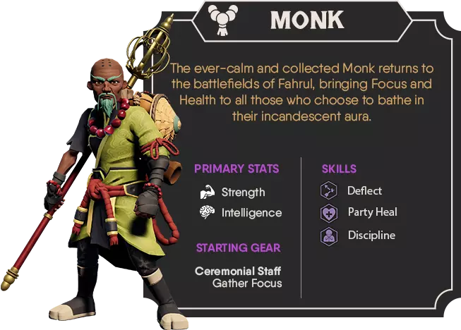《为了国王2》免费回归可玩角色——僧侣! 这位曾活跃于英雄殿堂的僧侣,如今带着其平和的反抗之举加入抵抗军,拥有一套熟悉的辅助技能组合,旨在保持队伍专注与健康。 你会很高兴得知,僧侣在法鲁尔大陆带来新技能的同时,依然保留着你所喜爱的《为了国王》中的独特魅力与玩法风格。