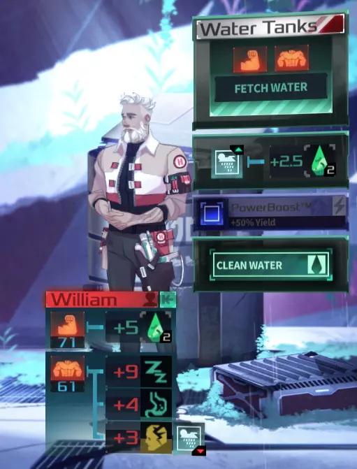 储水箱 幸运的是,“伊克西翁一号”坠毁在了一个存在一氧化二氢的地方,尽管水里充满了外星细菌。 《死在文兰》的粉丝们肯定对这个机制非常熟悉;) 每天,如果不给角色们喝水,他们就会脱水。你可以尝试给他们0.5份水,但他们仍有脱水的几率。