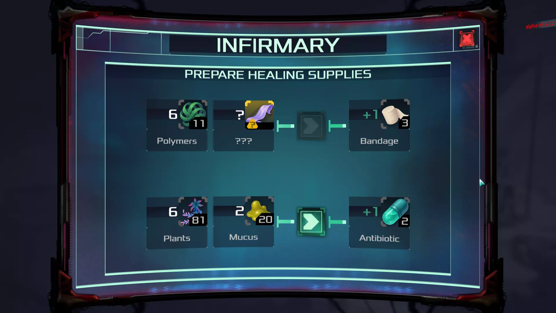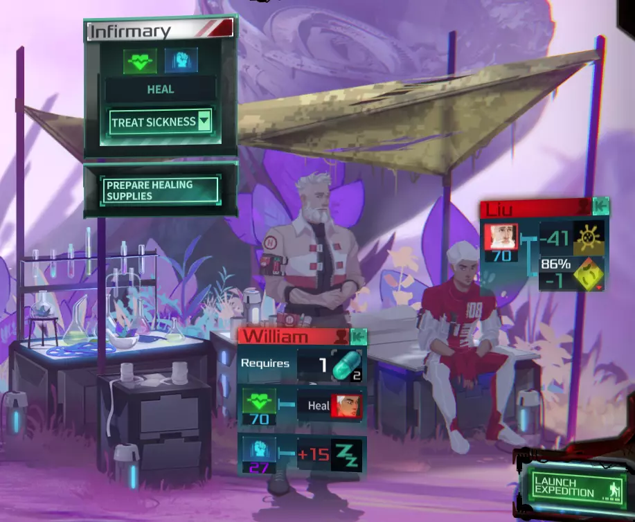 在安塔瑞斯 Prime 上,你会在很多情况下受伤或生病。你可不是来这儿度假的,但话说回来,死亡绝不是选项。 尽管你可能有一些药物能提供少量治疗,但要说恢复状态,没有什么比医务室更好的了。不过,和辅导室一样,这个设施需要一名“医疗兵”(威廉是最佳人选,但有时他可能有其他事情要处理,所以得由其他角色来承担这项工作)和一名患者。 每次使用该设施时,你可以选择治疗疾病或伤势,并且分别需要抗生素或绷带,这样医疗兵才能有治疗用品进行操作。