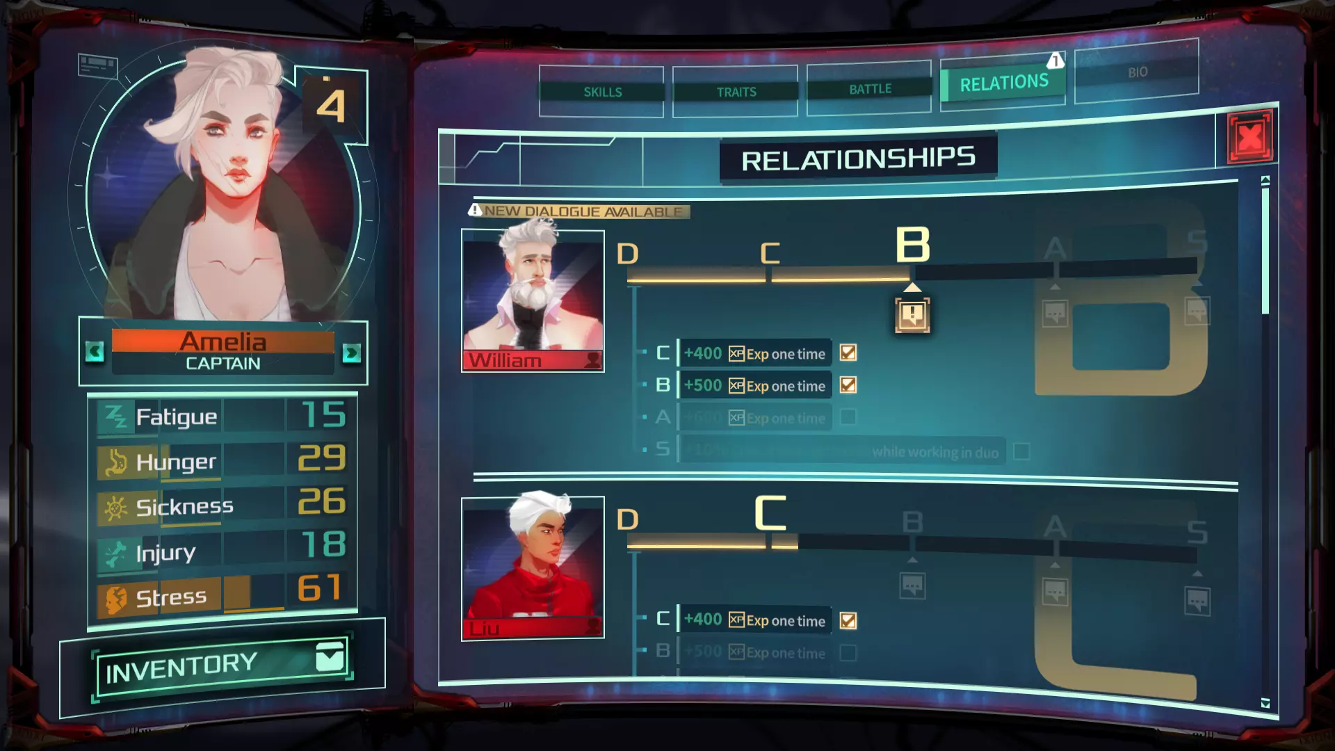《安塔瑞斯之死》与《英灵神殿》的不同之处在于,我们旨在进一步限制此类不稳定性,因此我们追求更具结构性和可预测性的设计。 每种关系都由一个计量条表示。每当两个角色共同行动时,无论是在探险、战斗还是营地中,他们的关系都会提升。每当关系达到一个阈值,就会为两个角色提供游戏内加成。