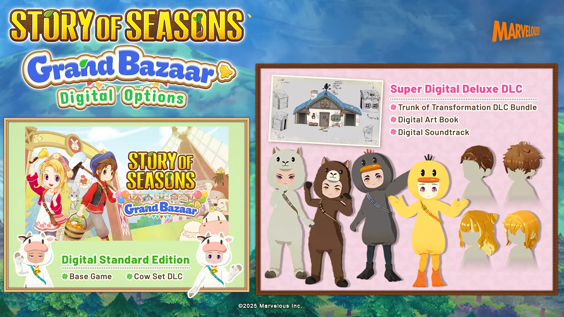 《牧场物语:集市》“变形行李箱捆绑包”DLC(9.99美元): “变形行李箱”外观DLC:小鸡服装(黄色)、小鸡头饰(黄色)、小鸡服装(黑色)、小鸡头饰(黑色)、羊驼服装(白色)、羊驼头饰(白色)、羊驼服装(棕色)、羊驼头饰(棕色)、忍者套装、忍者滑翔翼、忍者集市套装、编发配花、挑染猫耳发髻、短卷发、挑染侧分发型 《牧场物语:集市》“超级数字豪华DLC”套装(19美元)包含“变形之箱捆绑包”DLC,此外还有:《牧场物语:集市》数字原声带、《牧场物语:集市》数字艺术设定集。现在将《牧场物语:集市》加入愿望单,为8月27日开启的新生活与集市经营做好准备!