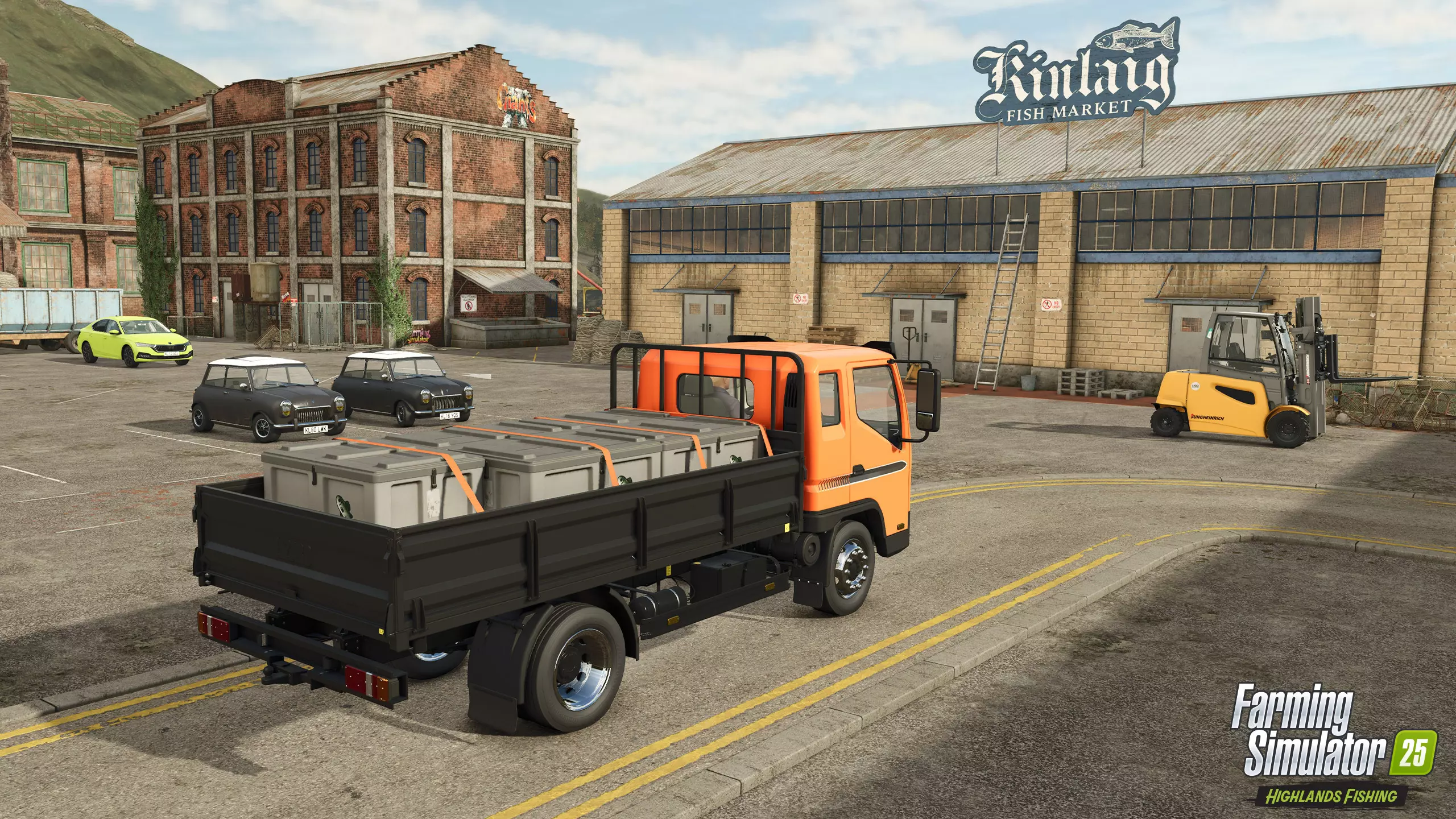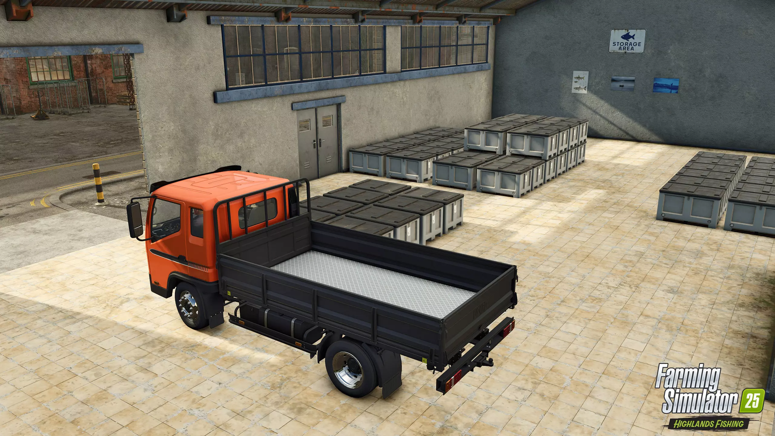 若要出售小鱼,需将它们带到鱼市场。在这个宽敞的仓储设施的指定区域卸下箱子即可获得报酬并完成交易。或者,你也可以使用叉车和斜坡,或船只内置的起重机将鱼送到货船上。