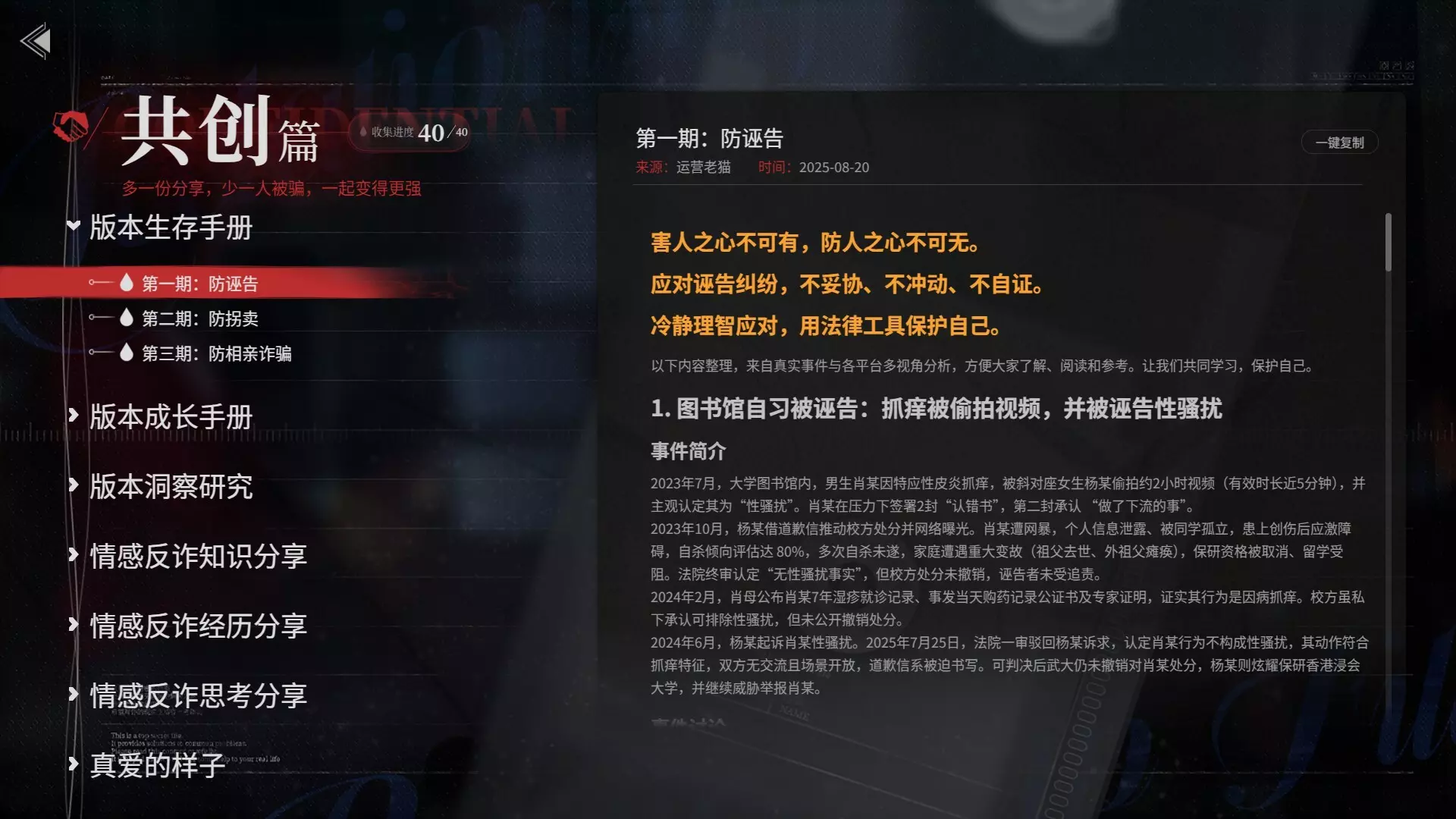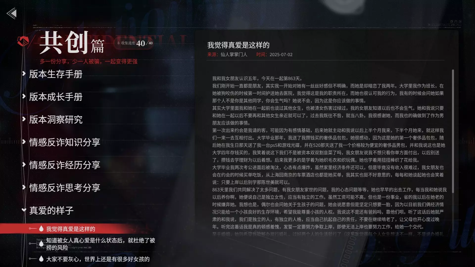 【版本手册系列】会持续更新,运营团队也会不断根据版本变化,收集和制作专题内容。 【更多内容】还在策划中,敬请期待。 五、最后,还想对你们说 感恩大家这三个月来的陪伴与鞭策。是你们的信任,让我们走到今天;是你们的建议,指引着我们变得更好。即使是严厉的批评,我们也知道,那是因为我们做的还不够好。总之,千言万语,都将汇聚成我们持续更新的动力,日久见人心。 如果你曾因最初的体验而离开,我们真心邀请你回来看看。我们相信,经过大家共同的打磨,现在的版本应该会给你带来不一样的感受。我们从来都不是一个人在战斗。因为有你们,我们才变得勇敢;因为有你们,我们从不孤单。 我们相信,万千细流,终能汇成江河。更公平更合理的新版本,终会到来。 《情感反诈模拟器》全体成员敬上