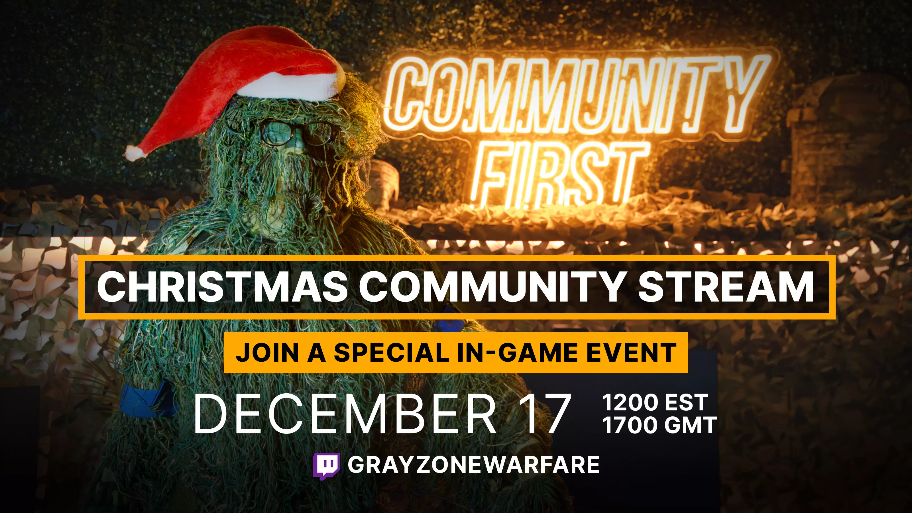 大家好,GZW社区成员们, 参与我们今年的最后一场直播吧,与开发者一同体验有趣的游戏内活动,并在直播中实时解答你关于游戏的疑问。 我们将于美国东部时间12月17日(星期三)中午12:00 / 格林尼治标准时间下午5:00 / 欧洲中部时间下午6:00在Twitch开启直播。 我们将在自定义服务器上进行游戏,并会在直播期间实时分享活动访问密码及参与说明。