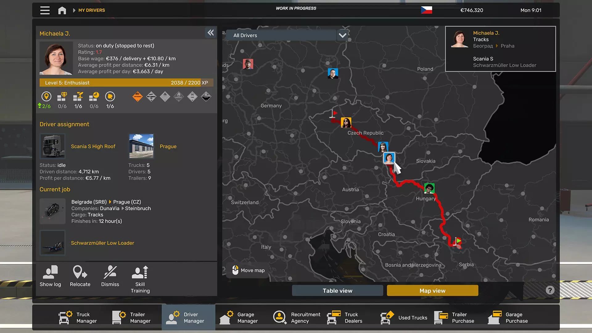 总体而言,新设计的快速信息面板自然融入了1.58版本更新的新UI方向,有助于我们打造更现代化、更灵活且面向未来的用户体验。 管理界面 - 便利性改进与漏洞修复 1.58版本更新对现有的管理界面进行了一系列优化完善,包括司机、挂车、卡车和车库管理界面。此次并非大规模重做,而是通过提升易用性、清晰度和整体完善度来优化现有功能,同时修复了一些小问题。 其中一项实用改进是提高了雇佣司机相关信息的可见性。玩家现在能够更轻松地追踪车手的技能进度,从而更清晰地了解车队的长期发展情况。此外,每位已雇佣车手当前选择的技能训练将在技能总览中直接高亮显示,让玩家能够一目了然。