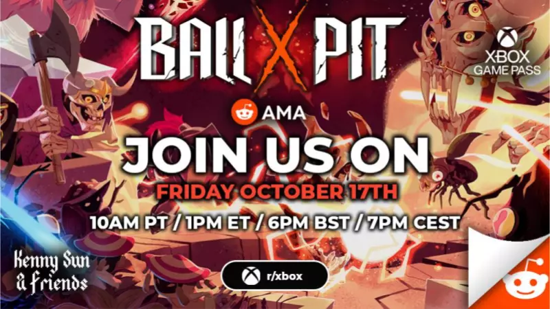 各位寻宝者们! 过去24小时真是太疯狂了! 在《BALL x PIT》发售的第一天,我们的同时在线玩家峰值突破了15,000人,目前的评价为“好评如潮”!对于我们这款小小的球类游戏来说,这是再好不过的开端了。我们从心底感谢大家! 现在,你们可能对《BALL x PIT》有一些疑问——比如它的开发情况以及未来的更新计划。因此,我们准备于明天,也就是10月17日星期五,美国东部时间下午1点/英国夏令时间下午6点/欧洲中部夏令时间晚上7点,在Reddit的r/Xbox版块举办一场AMA(有问必答)活动,诚挚邀请大家参加! Kenny本人和他的团队,以及Devolver的部分成员将到场回答你们的问题。尽管提问吧!BALL x PIT - Reddit 有问必答活动,嘉宾为 Kenny Sun 及其他朋友 活动地点:Xbox 子版块(r/Xbox) 活动时间:10月17日(周五)美国东部时间下午1点 / 英国夏令时间下午6点 / 欧洲中部夏令时间晚上7点