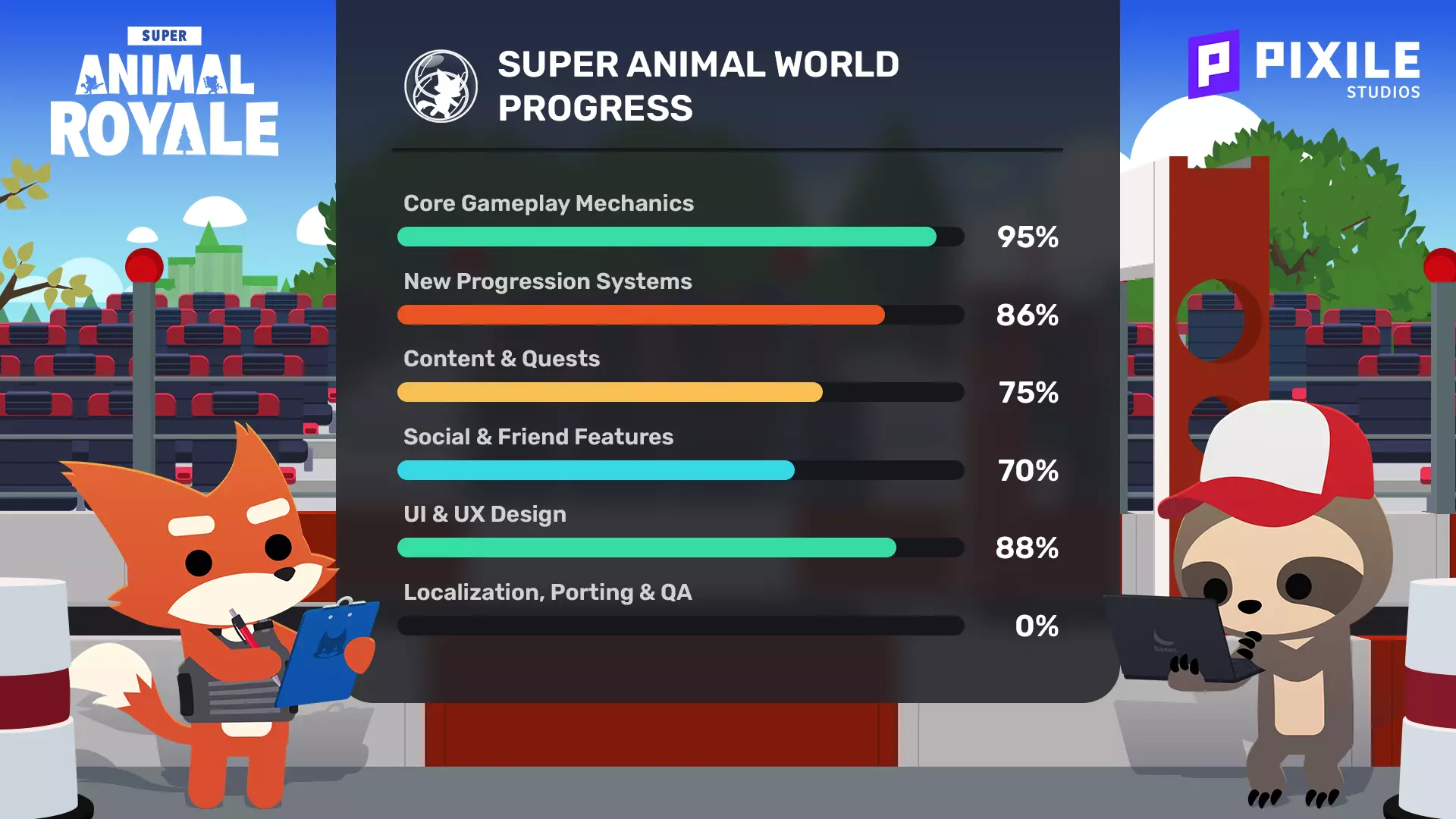 我们所有的核心机制都表现出色,尤其是本月在钓鱼玩法上取得重大突破后。虽然还需要一些打磨,但我们对整体进展感到非常兴奋!进度系统也有了长足的进步,目前已接近开发完成。 得益于额外的开发时间,我们增加了更多任务,并将故事扩展到了最初计划之外。看到这一切逐步成型令人激动,本月我们将专注于完成主线故事的结局。我们还敲定了社交和好友功能的关键决策,等准备就绪后迫不及待想展示给大家! 在用户界面/用户体验方面,设计和界面实现已进入最后阶段。很快,所有界面都将完成设计和实装,接下来只需打磨和优化交互体验。看到各项进度条都在接近终点线,这真的非常鼓舞人心。正如你所想,在我们转向本地化、移植和质量检测之前,整个团队正处于这个忙碌且专注的开发阶段。最重要的是,我们迫不及待地想尽快开始与大家分享更多关于超级动物世界的内容!超级动物大逃杀 @ BitSummit!