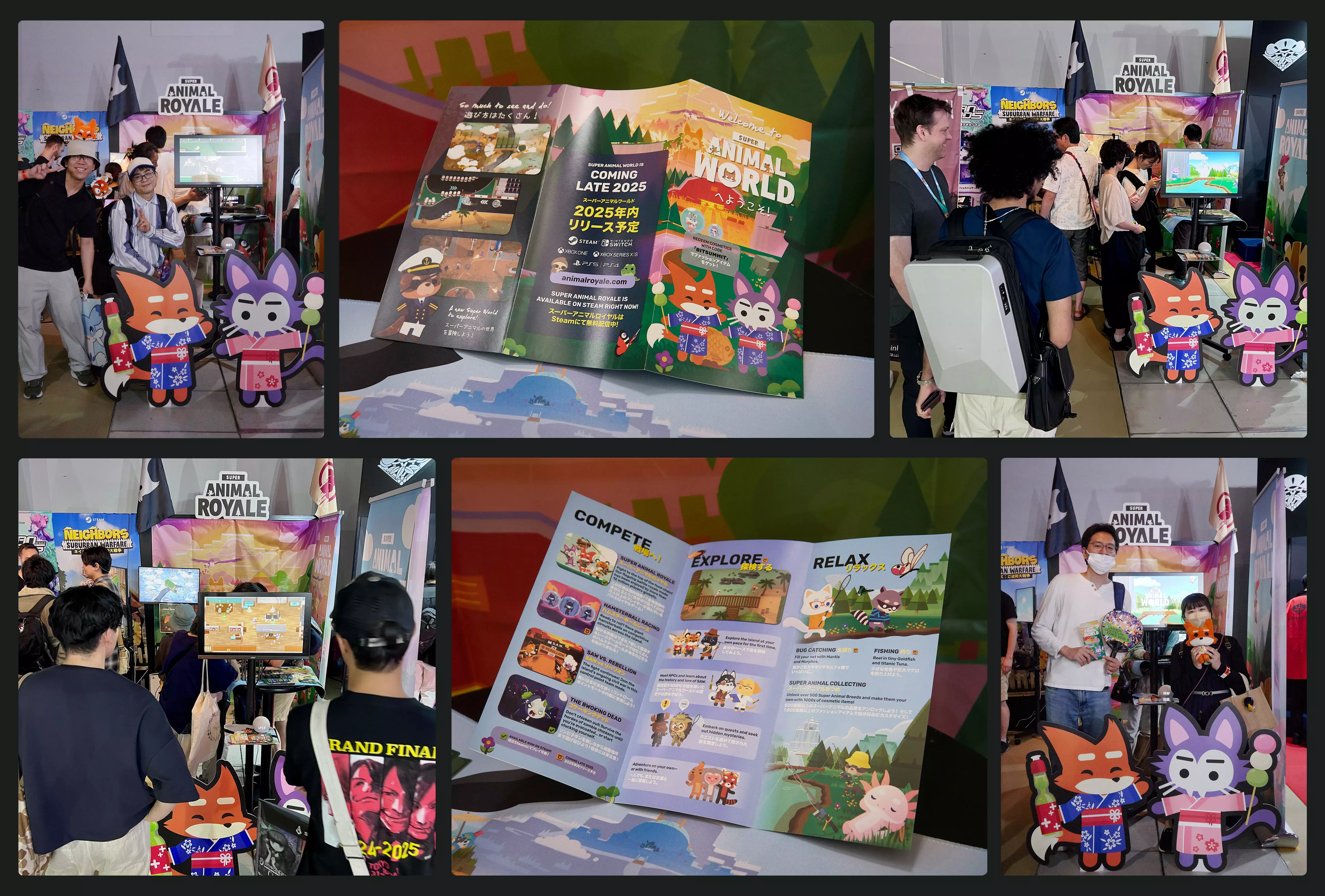 谢丽尔和迈克尔最近从京都回来,他们在BitSummit展会上展示了《超级动物大逃杀》,为其即将在亚洲地区推出的主机版预热!到目前为止,该游戏在该地区仅在PC/Steam平台上可用,因此我们很高兴能在今年晚些时候“超级动物世界”上线时,最终将其带到主机平台。 我们非常开心能向新玩家介绍这款游戏,分发以旅行为主题的“超级动物世界”宣传册,也很欢迎粉丝们前来与我们可爱的超级动物立牌合影。此行的一大亮点是能与社区的老成员们见面:非常感谢所有前来打招呼的人!同时也非常感谢Famitsu和IGN Japan帮助宣传这款游戏,并给我们机会在直播中谈论游戏相关内容。