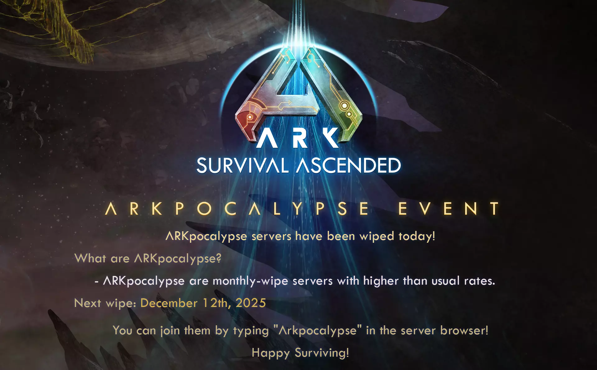 ARKpocalypse服务器今日已重置! 什么是ARKpocalypse? ARKpocalypse是每月重置的服务器,其倍率高于普通服务器。 下次重置时间:2025年12月12日 你可以在服务器浏览器中输入“Arkpocalypse”加入它们!祝你生存愉快!