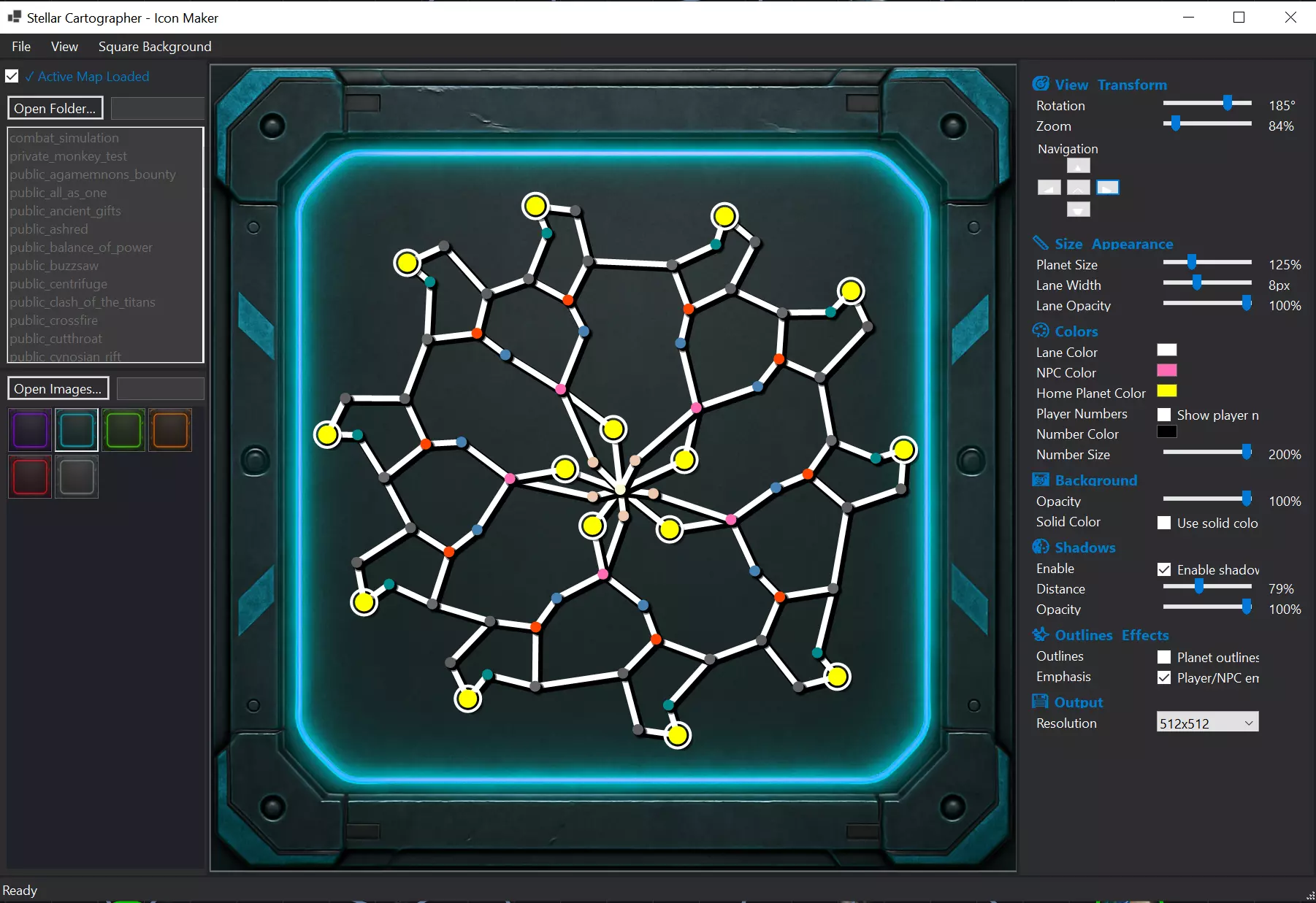 地图图标生成器 图标生成器让你能在很大程度上控制地图图像的生成方式。目前,我们用它来数据驱动地图图标,确保游戏中使用的图标能准确呈现地图本身。 图标生成器控制项: 旋转与缩放(以便在框内恰当显示) 导航(移动地图数据以更好地适配框内显示) 星球与相位航道大小调整 场景中物体的着色 用于增强对比度的投影 用于强调的轮廓效果 输出分辨率 除了允许手动选择地图或从当前正在处理的地图进行数据驱动外,该应用还支持使用任何方形背景图像,因此不必局限于提供的背景。提供的背景仅为我们内部用于表示地图尺寸的素材。当你对图标满意后,可以关闭图标制作器,应用程序会记住你的配置,这样当你完整保存地图时,也会同时生成图像。 此工具正在积极开发中。请留意其发布信息,以便在不久的将来进行早期测试!