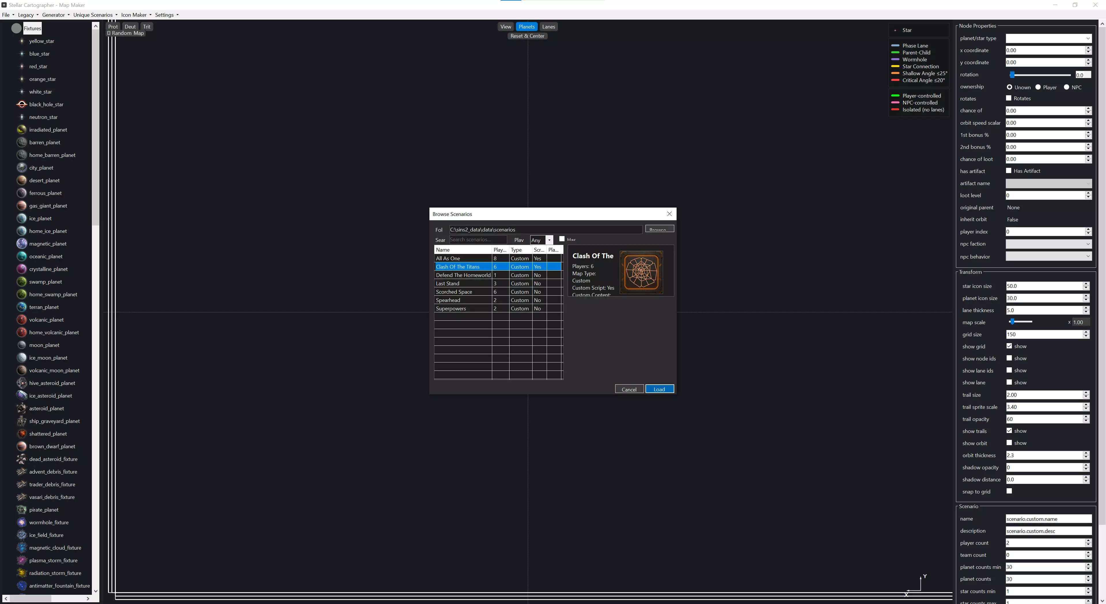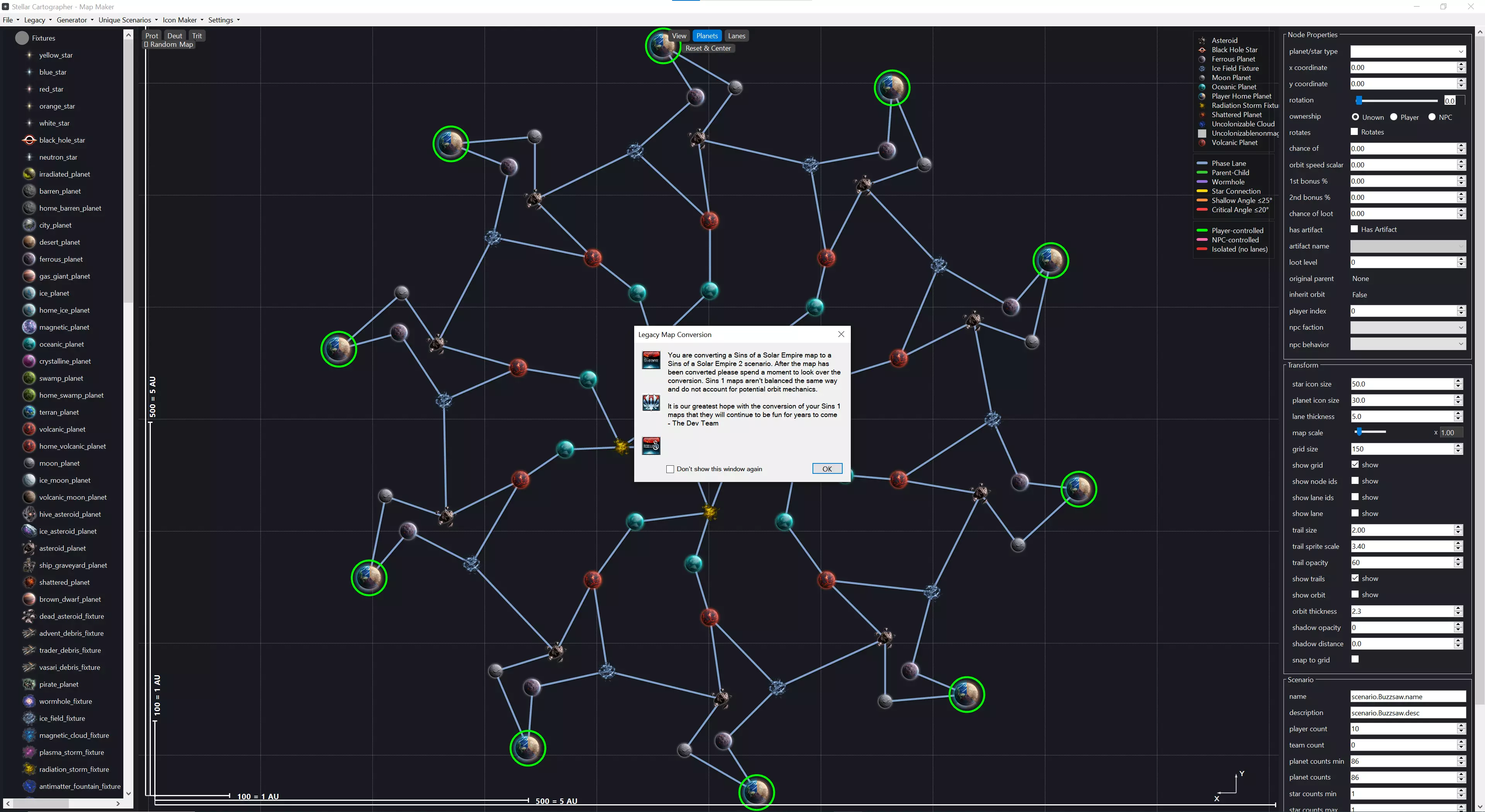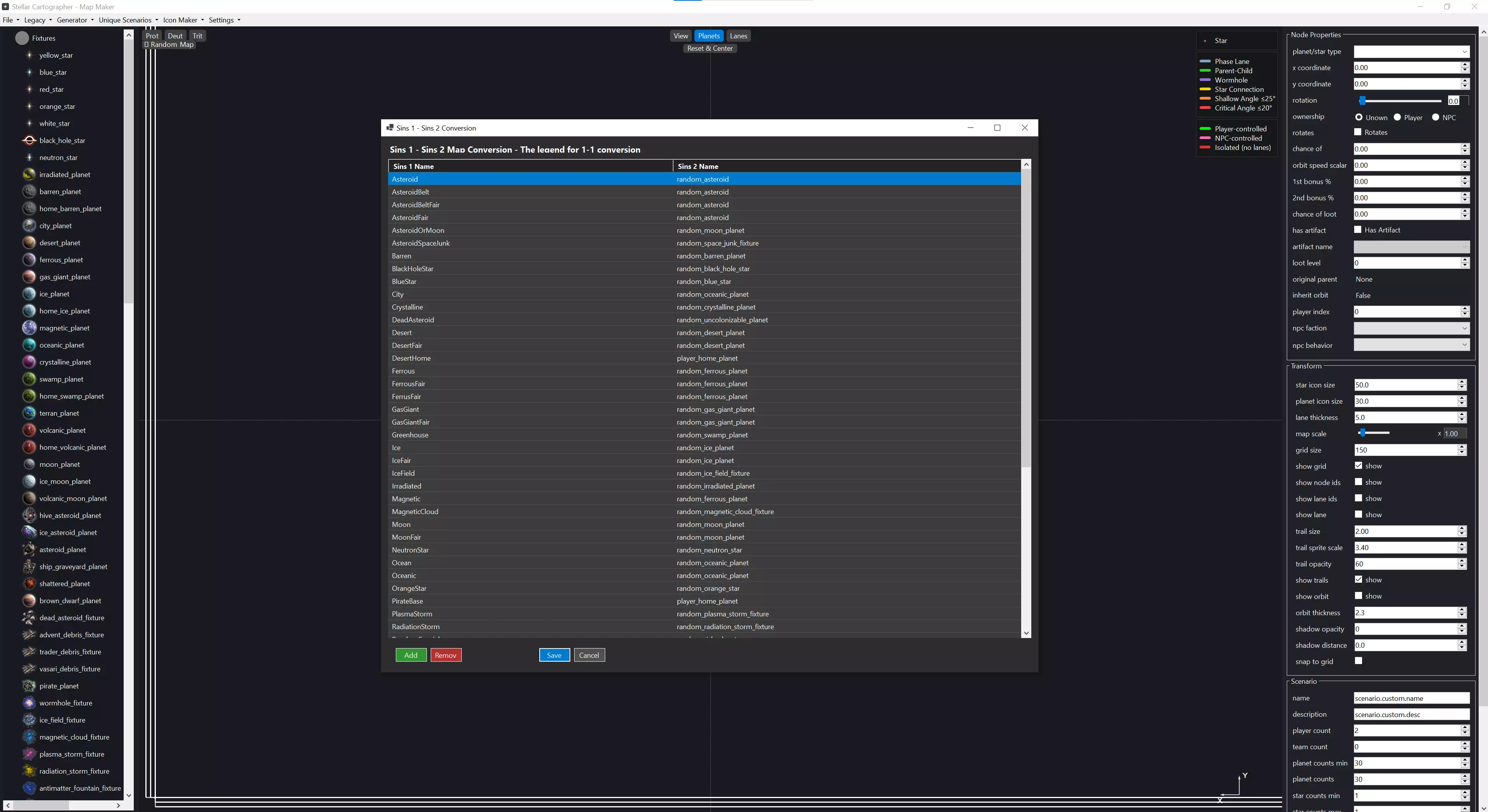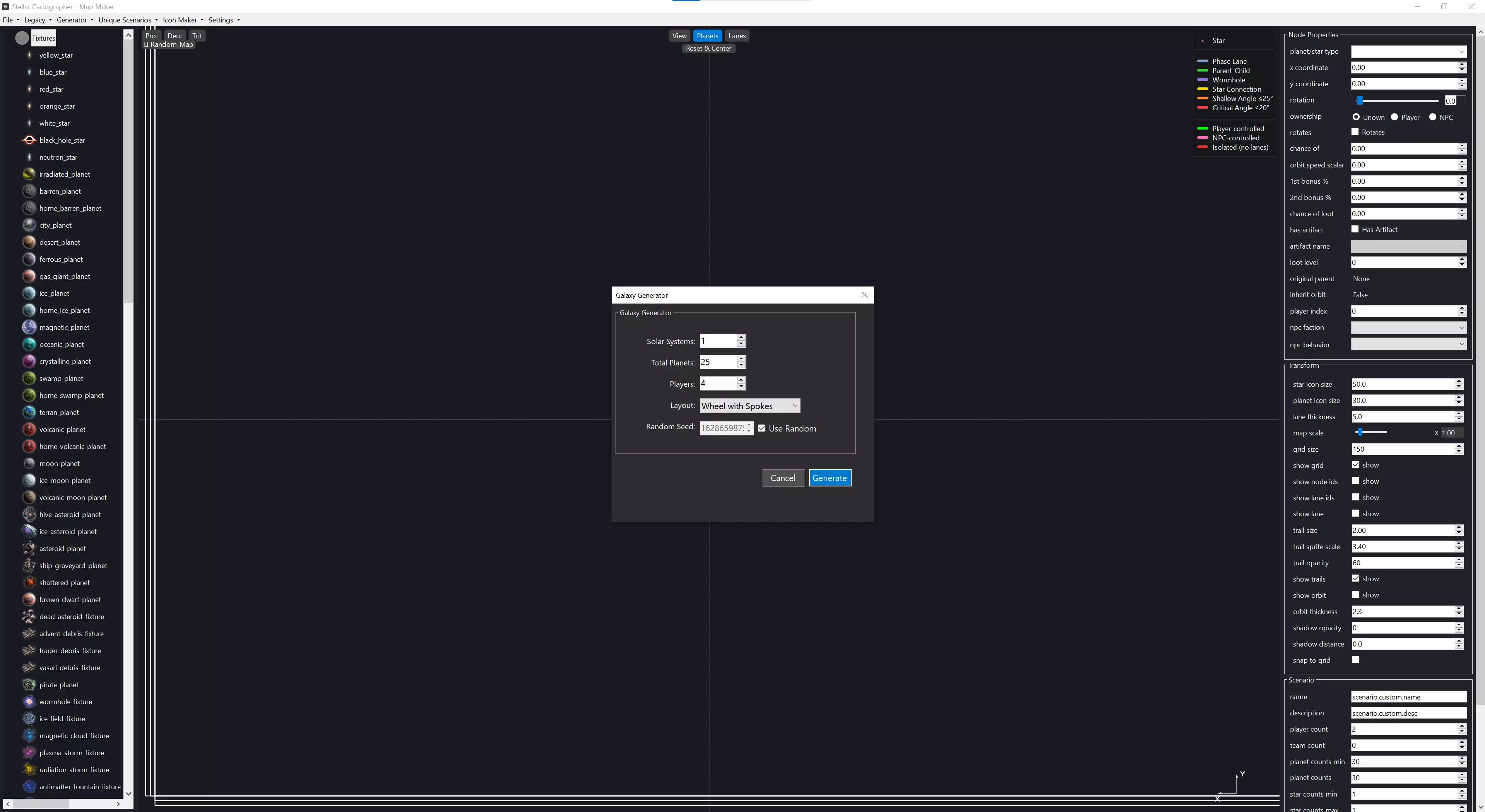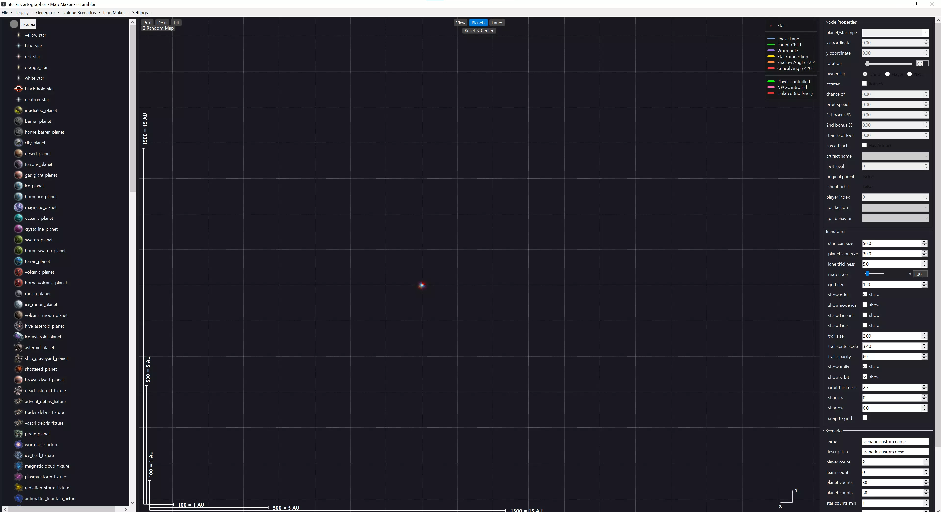 新地图视图 这是你将与之交互的应用程序基本布局。打开应用程序或开始新地图时,总是会从世界原点的随机恒星开始,这样你就知道中心位置以及恒星的必要性。左侧是你的星系生成器。应用程序的这部分直接连接到游戏的[c]galaxy_generator.uniform[/c],因此你可以将任何行星类型拖放到地图创建视口中,而无需通过下拉菜单查找特定类型。这也允许模组轻松添加自定义行星类型,并在应用程序中直观地显示出来。 右侧面板包含节点属性、用于查看的变换选项以及你的场景信息。节点属性是针对单独选中的行星/资源井/恒星的设置。它允许你调整单个天体的各项参数。变换(Transform)部分用于根据你的需求自定义地图创建体验,你可以在此调整相位航道的粗细、行星/恒星的大小、轨道轨迹,还能开关相位航道和行星ID显示等诸多功能。 底部是场景(Scenario)和地图信息(Map Info)部分。场景本质上是实时显示当前地图上行星和恒星数量的面板,同时你可以在此设定地图名称和描述。地图信息则是一个随机地图生成器,带有种子控制功能,可确保地图的可重复性。