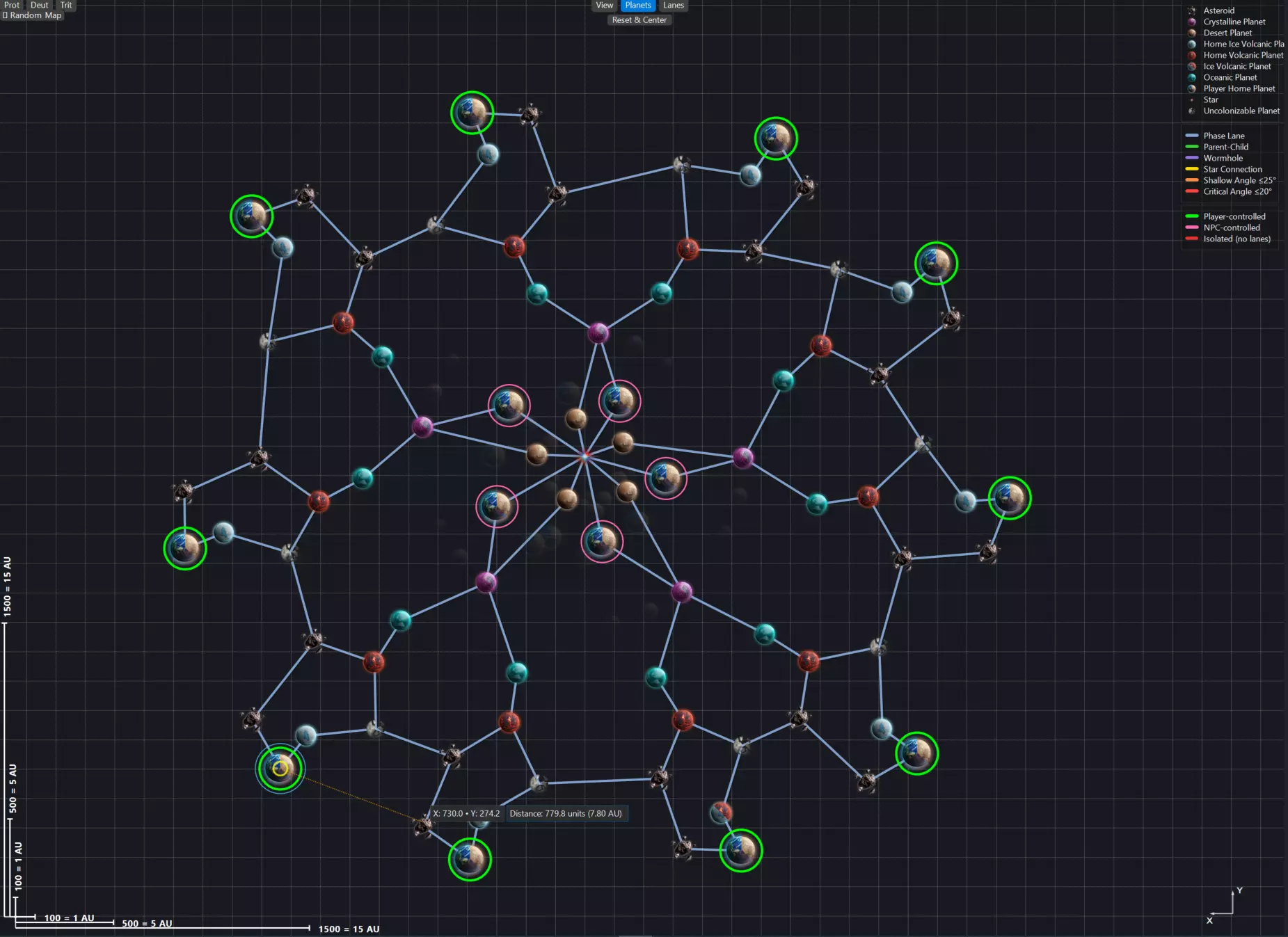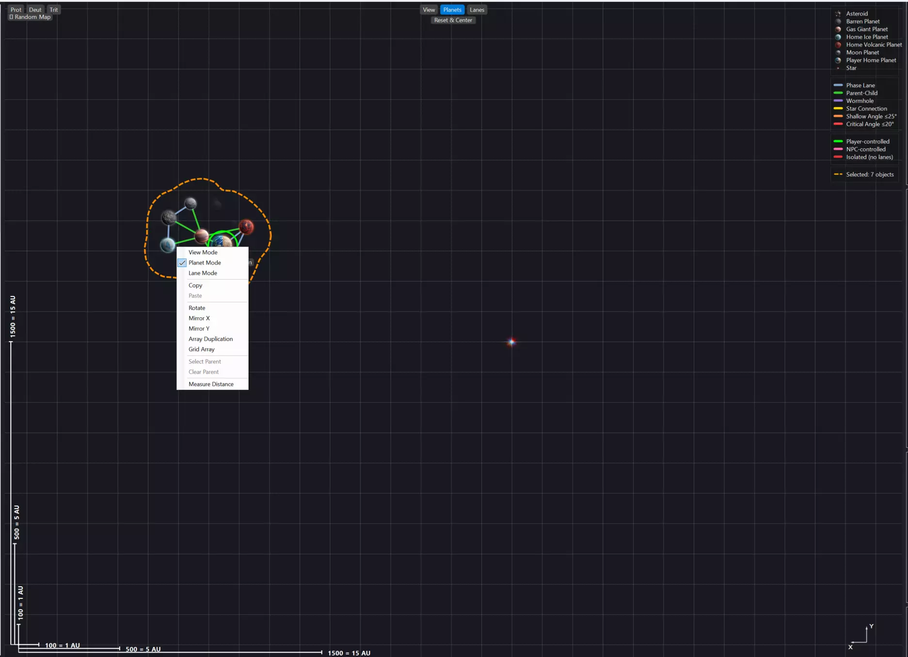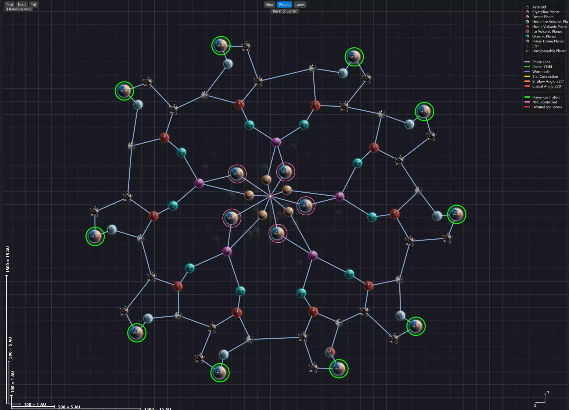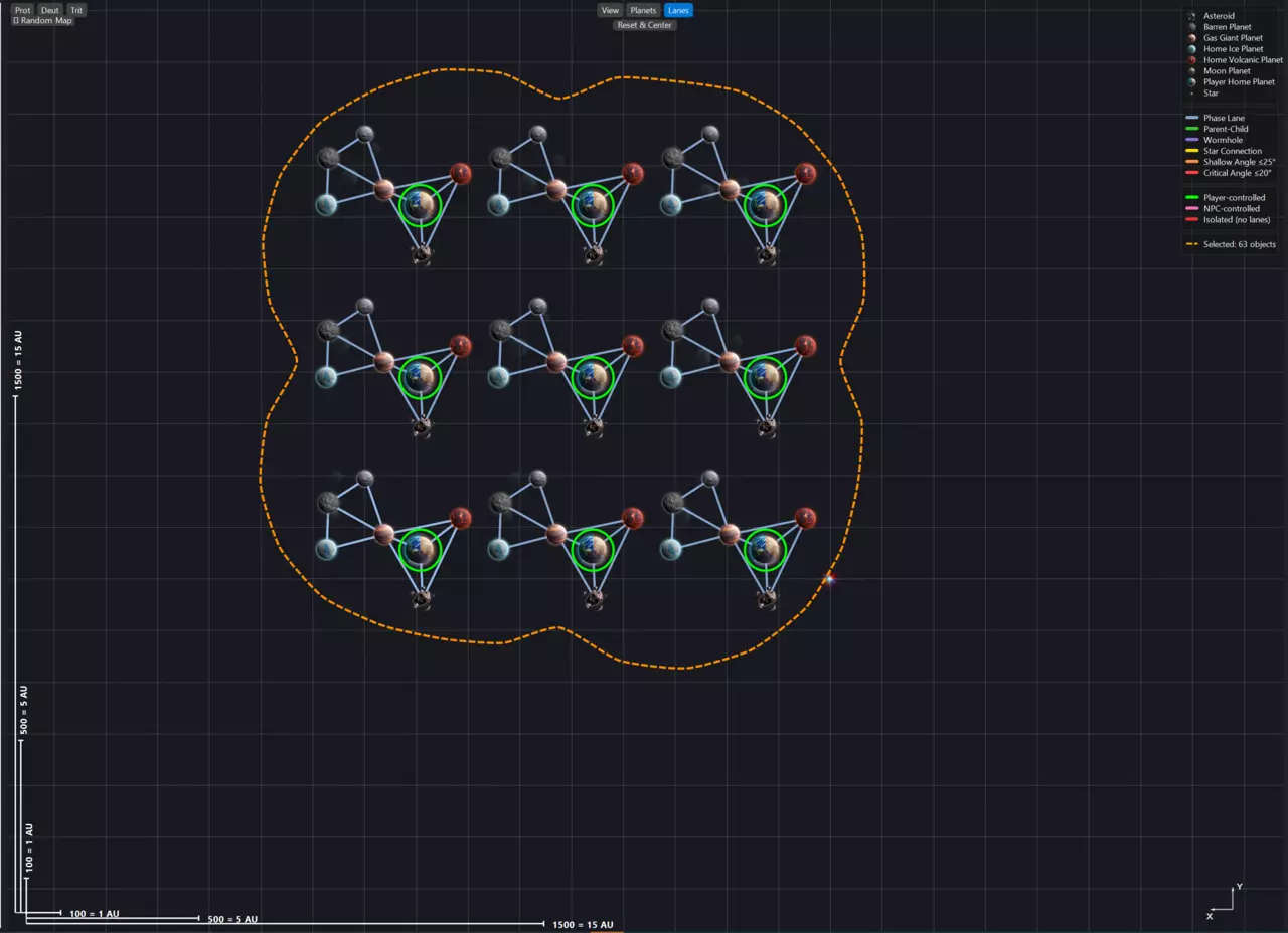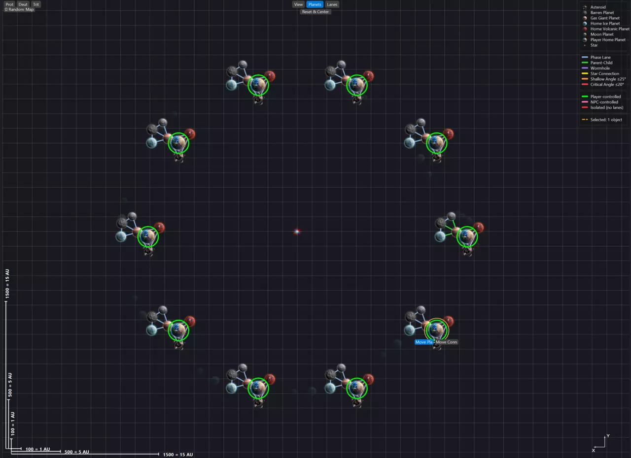 地图视口 现在让我们来看看视口本身:我们对建造过程中地图的可视化和可读性进行了重大改进。从左上角开始,我们提供了针对红绿色盲、蓝黄色盲和全色盲这三种主要色盲类型的基本视口控制选项。其下方是一个位置便捷的随机地图生成按钮,该按钮将使用保存的设置来生成地图。右上角是图例。《太阳熔炉》曾因可读性不佳而受到诟病。我们在此尽力改善这一问题,不仅在视口中使用地图图像,还提供实时图例来说明各种元素:从行星到相位航道以及所有权归属,所有信息都能一目了然。右下角是基础星图,方便你在设计地图时辨别方向;左下角是测量工具,能让你准确了解正在制作的地图实际大小。考虑到像“新星炮(Novalith)”这类武器有X射程,了解地图物体间的距离就显得尤为重要。 视口顶部中央是模式控制区,可让你精确控制地图的构建部分。 “查看(View)”本质上是一种只读的地图查看方式。你可以在视口中选择单个物体并调整其节点属性,但无法移动任何物体。此模式下,地图元素会保持固定但可被选中。 “行星(Planets)”是你的轨道天体放置模式,用于放置行星、引力井和恒星。在此模式下,所有物品均可放置和移动。只需从左侧面板中选中并将其拖入视口即可。 “星轨”是你的相位航道创建和编辑模式。在此模式下,只需点击一个物体并拖动至另一个物体,即可创建相位航道。当你连接恒星/虫洞时,应用程序会自动检测并创建相应的航道,无需你进行额外操作。你也可以使用此模式删除相位航道(在行星模式下,相位航道完全不可选中)。