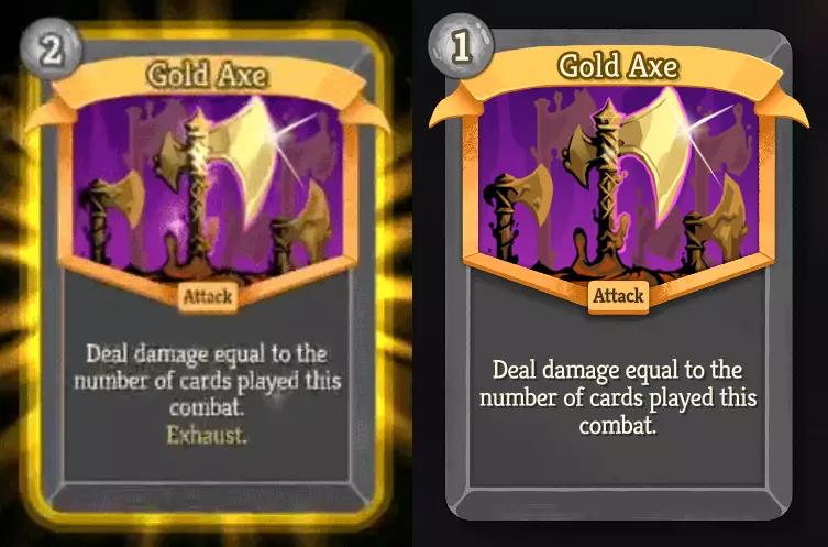 我们最早在2024年11月预告的新卡牌之一是“黄金战斧”。尽管它在初始状态就已备受期待,但后续进行了增强:移除了“消耗”关键词,并降低了能量消耗。未展示内容:我们仍保留了基于卡牌奖励稀有度的闪亮视觉特效,不过相比左侧展示的效果有所减弱。