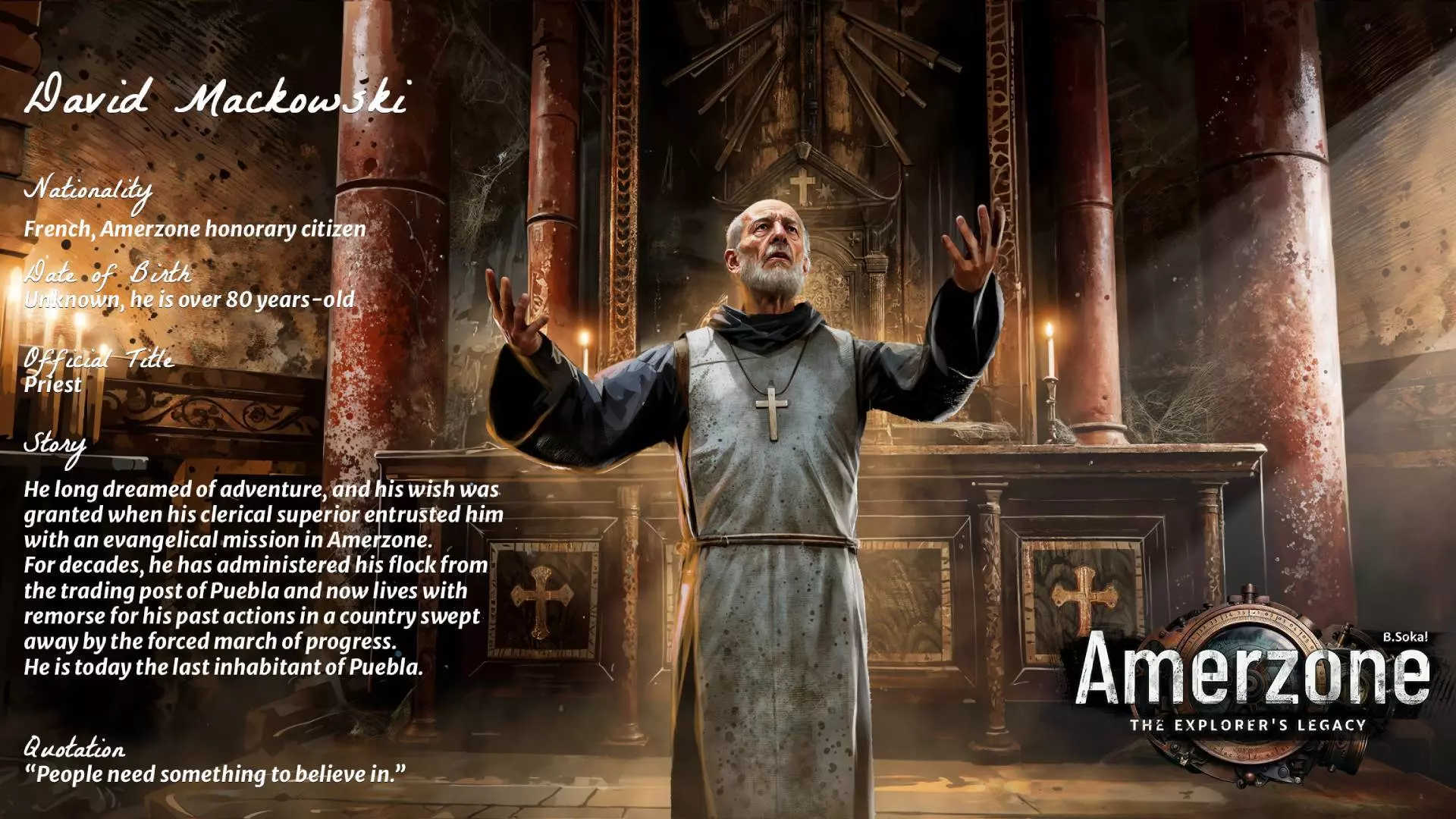 各位探索者,大家好: 大卫·麦考斯基被派往阿莫尔地区时,坚信自己所宣扬的事业是正义的。和他的同伴们一样,他真心认为自己的理念能让这个国家变得更好。他的行为或许不像瓦伦布瓦或阿尔瓦雷斯那般张扬,但仍以缓慢却持续的方式推动了阿莫尔地区的衰败。当他意识到自己的错误时,一切都已太迟:人们早已背弃了他们的传统。 ⛪ 来认识一下大卫·麦考斯基,这位神父 ⛪