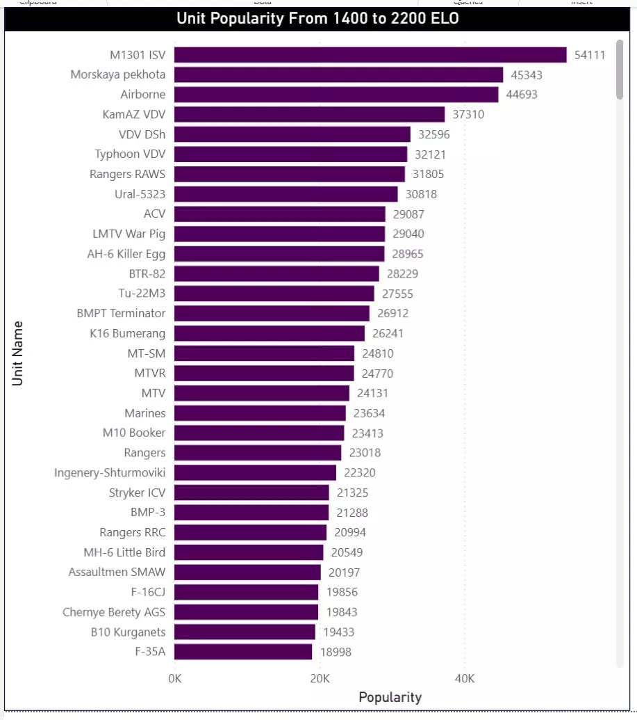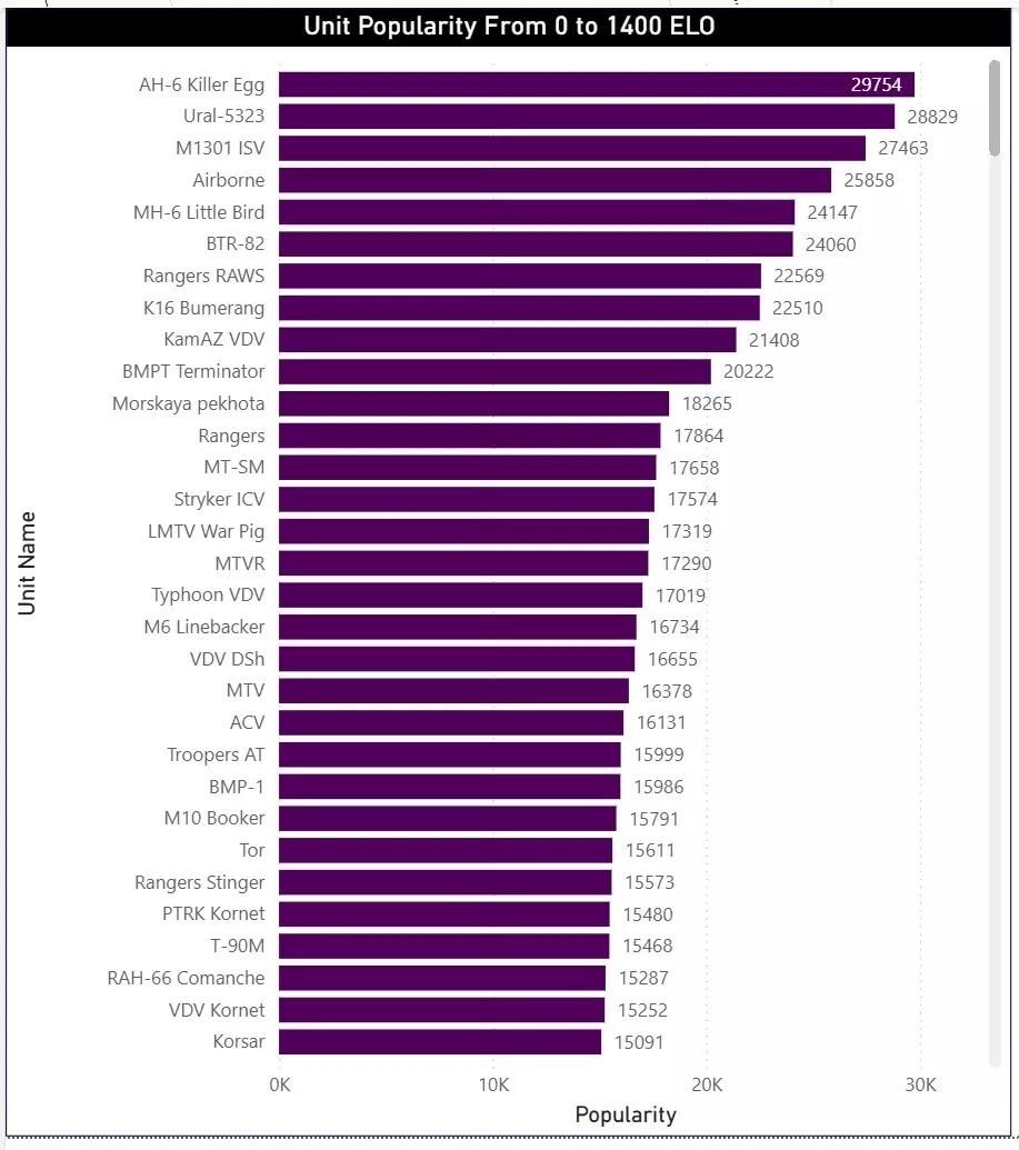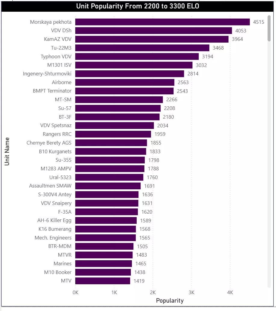 最后,我们还按ELO分段列出了最受欢迎的单位列表。这些表格展示了在不同技能水平的玩家中,哪些单位被认为是最有效且使用频率最高的。该数据集也包含镜像对战(Mirror Matches),不过研究结果仍然具有很高的参考价值。