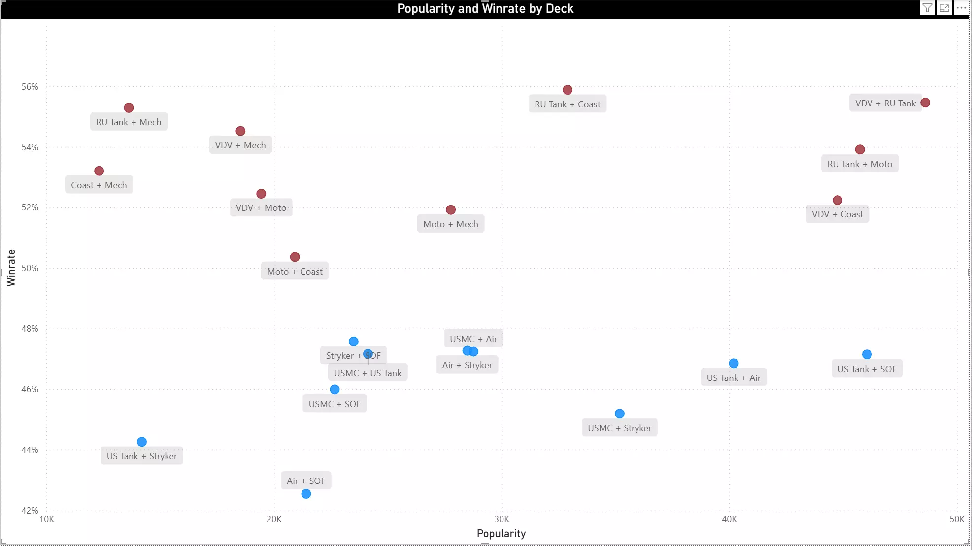 下一张图表展示了所有可用专精组合按胜率和 popularity(选择频率)的分布情况。我们邀请你在评论区分享你的结论——你对平衡性改进的想法和建议非常有价值。请注意,在此语境中,“popularity”指的是专精的选择频率,而非其战斗效能。