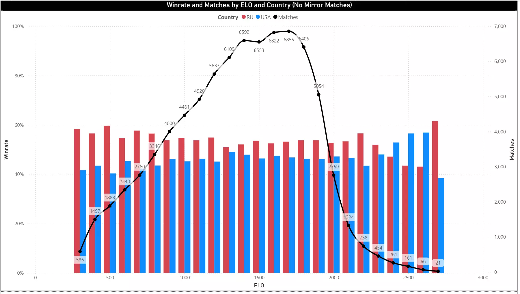 现在,来看看一些全新且有趣的内容:1.0.10版本更新后的胜率统计——这次按ELO分段。所展示的图表表明,之前发布的未考虑玩家技能水平的图表虽然相当准确地反映了整体情况,但并非完全正确:在几乎所有ELO等级中,有一个阵营始终比另一个阵营占据优势。与总体情况的偏差仅出现在较高ELO等级中——那里的情况看起来不那么明朗,但比赛数量也显著减少。最近旨在缩小玩家数量最多的ELO区间内整体差距的几次版本更新,是朝着正确方向迈出的步伐。