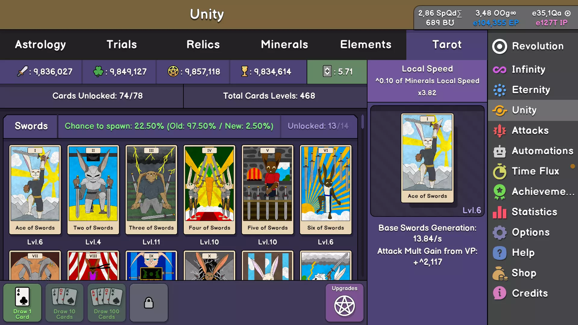 塔罗牌 收集具有特殊能力的独特卡牌,塑造你的命运。 黑宝石可让你抽取塔罗牌,每张牌都有独特属性(宝剑、权杖、星币和圣杯)。每副牌的王牌都会生成塔罗资源。 特殊卡牌“阿卡纳”能赋予可激活的技能!
