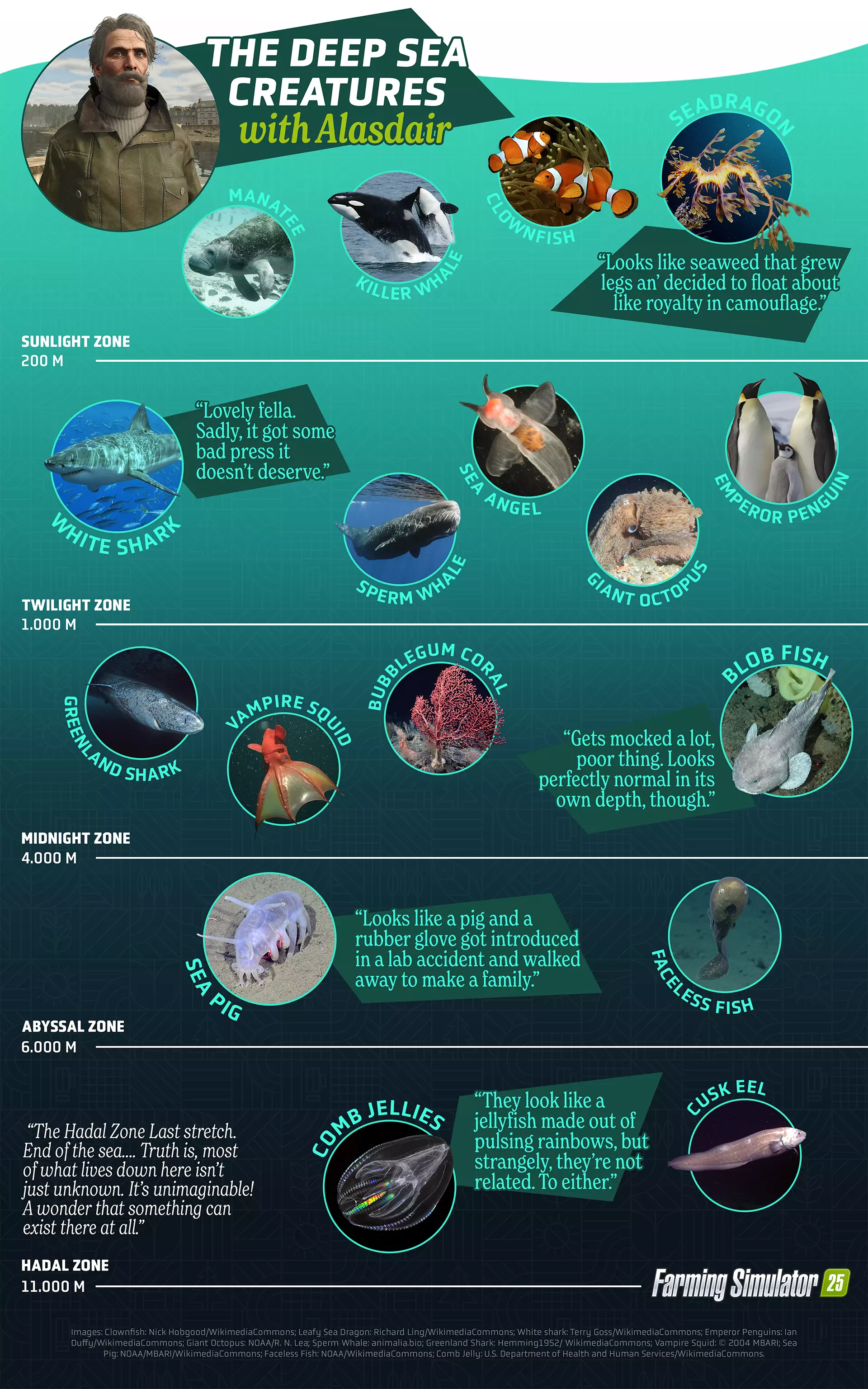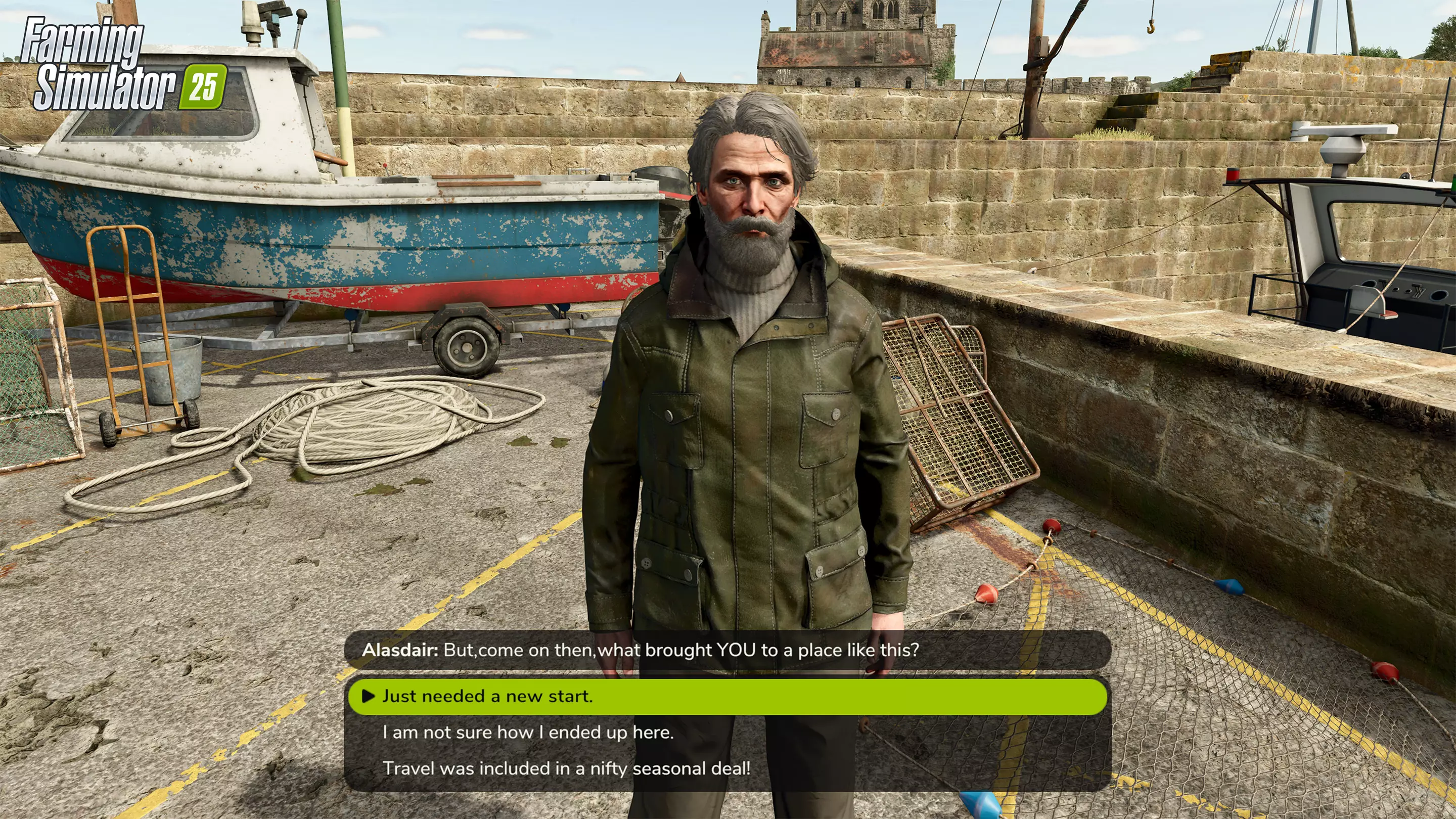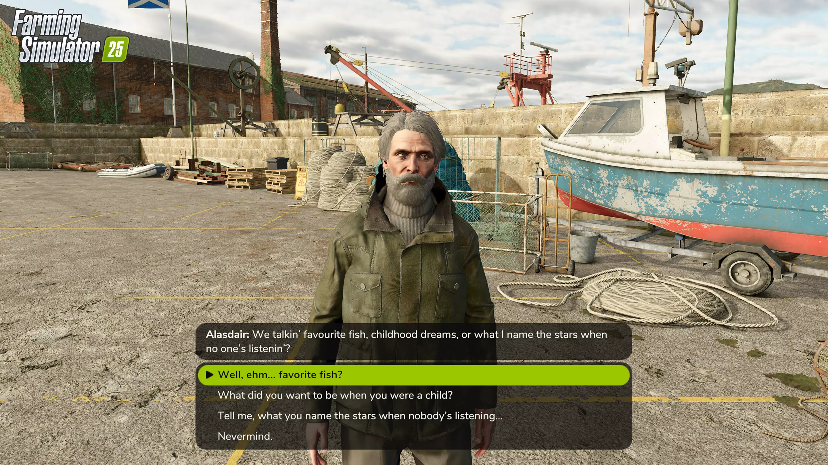 一千米深处,灯火熄灭。太阳彻底放弃,收拾行囊,一去不回。能见度?不过是个糟糕的传言罢了! 安康鱼登场:就那么漂着,那张怪脸前挂着盏傻乎乎的小灯晃来晃去。 它大概是用这灯来寻找新西兰橙鲷(Orange Roughy)的,没错,信不信由你,这就是它的真名。 亮橙色,却生活在黑暗里。要我说,进化这玩意儿幽默感可真扭曲。 有问题?这就解答! 阿拉斯代尔的声音是AI吗? 不是! 和其他人一样,他的声音是真实的。我们邀请了才华横溢的英国配音演员约翰·肯纳德进行录制,为我们的渔夫赋予了(真实的)魅力与个性。自从我们开始录制并给了他《模拟农场25》的激活码后,他就彻底迷上了这款游戏,已经投入了好几百个小时——可以说,他对此也相当投入。 这可不是高地口音! 没人说过他是那里的人!除此之外,我们还得在英式风格和清晰易懂的对话之间找到平衡,即使不看字幕也能听懂(因为我们也有很多非常年轻的玩家)。 我们进行了大量测试——不同的口音、各种强度、更多的航海词汇、更少的航海词汇、更多的冷笑话、更少的冷笑话,最终我们找到了这个平衡点。 他会聊些什么呢? 他只会稍微谈谈自己,更多的会聚焦于海洋、它们的差异、海洋生物以及海洋的重要性。此外,他还能为你提供一些钓鱼技巧。无论你是想拿起钓竿在岸边放松,还是想更认真地经营水产养殖场。 他会出现在其他地图吗? 阿拉斯代尔(新)的家在金莱格,所以他只会常驻在我们新扩展地图的港口。那里让他感到舒适。 准备好钓鱼了吗? 有了《高地钓鱼》,你还可以开展更大规模、更专业的渔业作业。鱼类养殖设施、近海水产养殖场、饲料生产以及运输船只,让你在农业、畜牧业和林业之外,开辟新的业务线。 现在预购可享9折优惠——或者购买包含该扩展包及三个额外包的“第一年季票”!《高地钓鱼》将于11月4日在PC和主机平台发售。