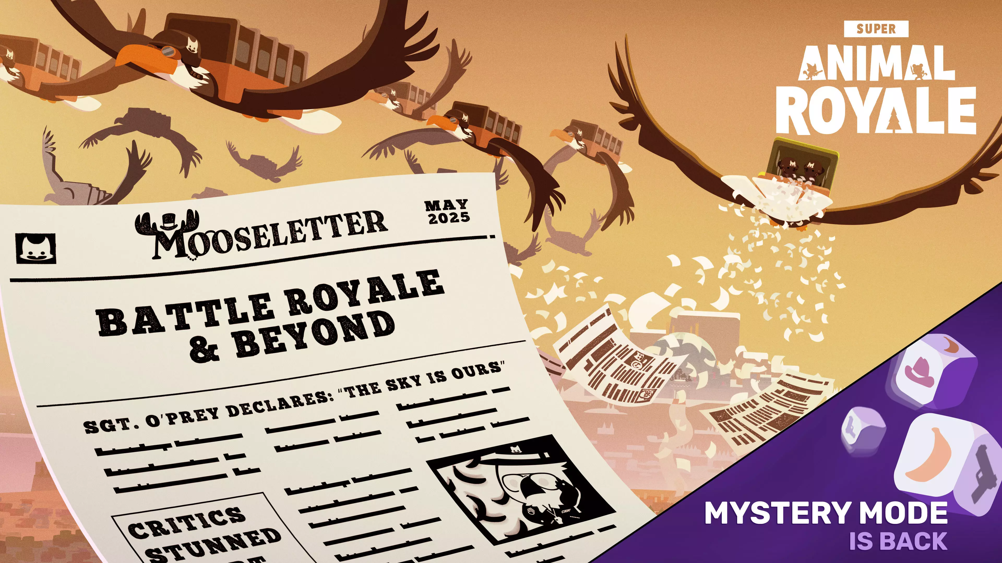 Our core game modes are the heart of Super Animal Royale, and we’ve spent years refining them—nearly eight in the case of Battle Royale! It’s more polished than ever, but there’s still room to grow, and we have some exciting new additions planned. The other modes have had varying levels of iteration so far, and we’ve got bigger ideas for them too, which we’ll dive into below. Super Animal World’s Social Hub is designed to support and enhance all of our modes while laying the foundation for future ones. It’s not just another mode — it’s the connective tissue between them. Whether you're queuing for a match or exploring between rounds, the Social Hub helps bring it all together in a more social and seamless way. We know it might be hard to picture how that all fits without seeing it in action, but we’re really happy with how it’s shaping up and can’t wait to show it to you in the coming months. Until then, here’s a look at where each of our modes stands today, what we’ve learned from working on them, and what we’re looking to explore next. Battle Royale Battle Royale remains our most developed mode, and that depth means we approach changes to it with extra care. We aim to keep the loot pool focused, with each item serving a clear role, while still leaving room for surprises and fun twists. Your feedback, especially in Discord and across our social channels, continues to be invaluable in helping us fine-tune what belongs and what doesn’t—so keep it coming! For Battle Royale in the Super Animal World expansion, we're focusing on thoughtful refinements, improving accessibility for newer players, and introducing a few meaningful new systems that deepen the experience without disrupting what already works. The expansion will also include some significant additions to the island itself, which we’re excited to let you discover for yourself when it arrives. While we can’t share specifics just yet, we want you to know that BR remains a core priority. As a small thank you for your patience, we’ve also cooked up something new for the Super Summer Royale event this July, so keep your eyes peeled! The Bwoking Dead Once Super Animal World is out, The Bwoking Dead is high on our list for a major revamp, similar in scope to S.A.W. vs. Rebellion’s 2022 rework. The core infection gameplay already creates great tension, but we’ve been gathering ideas to push the mode further and make it more engaging across the board. Two areas we’re especially looking to refine are the pacing of matches and the experience of playing as a Zombie Joe. We want being infected to feel more fun and rewarding, with new tools to pressure survivors and shift the momentum. On the survivor side, we’re exploring ways to encourage more movement around the island to keep matches dynamic and strategies evolving. We’re still shaping our plans, but this is a mode we’re eager to revisit, and we think it holds a lot of untapped potential. S.A.W. vs. Rebellion S.A.W. vs. Rebellion has grown into a great entry point for newer players, thanks to its loadout-based design and the ability to respawn quickly. It offers a lower-pressure way to get familiar with weapons and movement, making it a helpful bridge into Battle Royale. While the mode feels solid today, we have some ideas we’re looking forward to testing, including potential changes to Twinkle and balance tweaks. As the island evolves, we’re also keeping SvR in mind to see which new locations could support fresh maps for the mode. Once Super Animal World is out the door, we’ll keep looking for smart ways to evolve and improve the mode, with a focus on making it even more strategic, satisfying, and fun to play across all skill levels. Mystery Mode Mystery Mode was one of our earliest alternate modes, and as a result it’s also the least developed today. We know it has a special place in many of your hearts, but we see a lot of room to reimagine it into something more exciting and replayable while keeping the spirit and wacky variety of the original. After releasing Mystery Mode, we took time to rethink our approach to new modes. Instead of rushing lots of them out the door, we wanted each one to be deep and fun enough to earn a long-term slot in the game, and we planned to achieve that by continuing to refine and expand modes after their initial release. We’ve already started brainstorming ideas for Mystery Mode’s future, but since it’ll take significant development time, we plan to revisit it after Super Animal World launches. In the meantime, we’re happy to rotate it in occasionally for those who enjoy its chaotic surprises, and we’d love to hear what you’d be excited to see in a future rework. Whether it’s Mystery Mode, S.A.W. vs. Rebellion, The Bwoking Dead or Battle Royale itself, your feedback continues to play a big role in how we evolve all of our game modes, so keep letting us know what you want to see in our Discord, here on Steam, and across our socials. And speaking of Battle Royale’s future in Super Animal World, we’ve got someone special to introduce you to: your feathered flight commander and champion of the skies, Sergeant O’Prey! Introducing Sergeant O’Prey