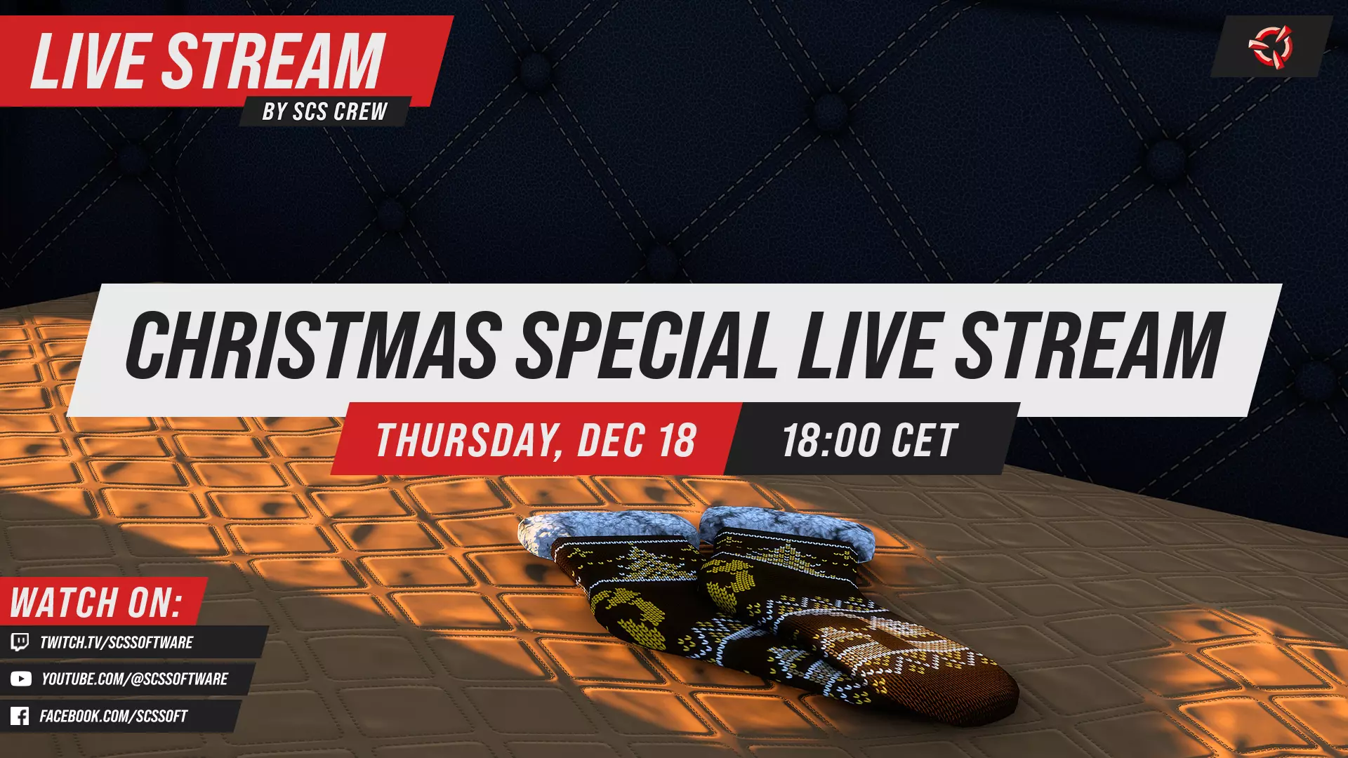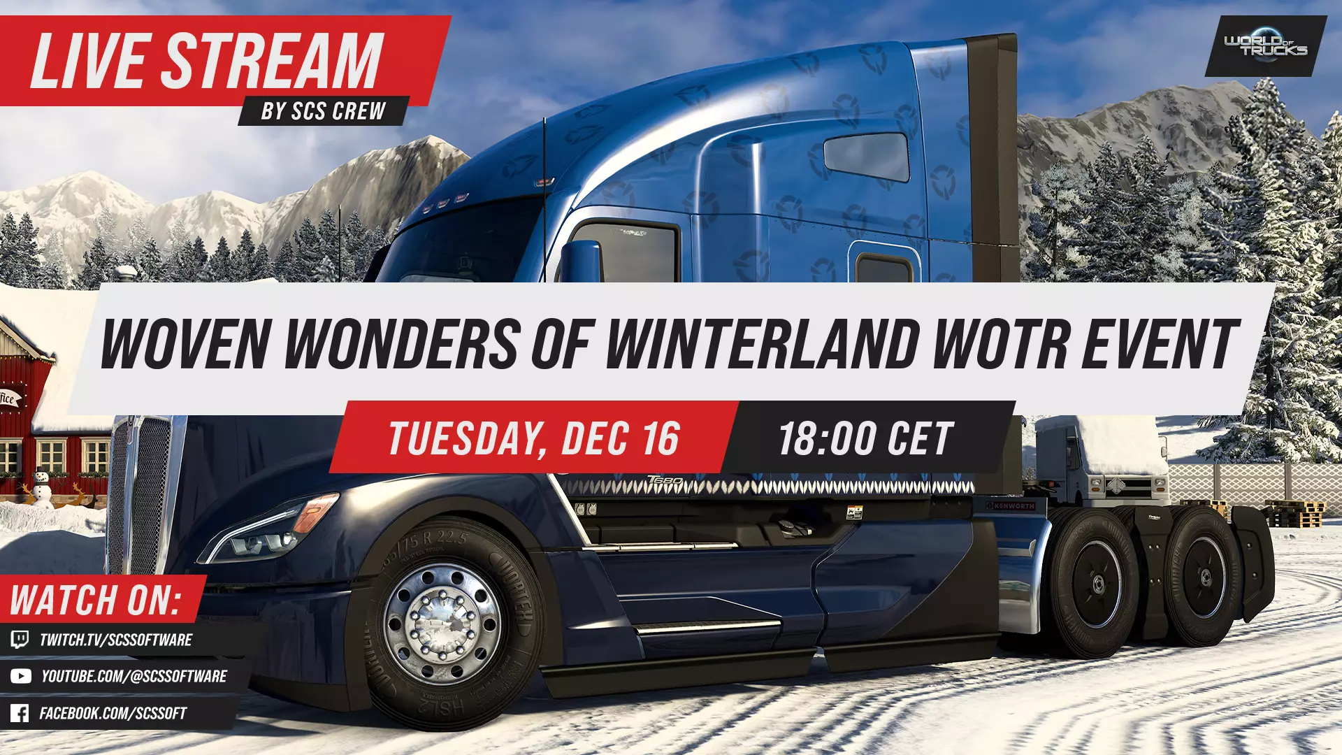 另外,请在12月18日欧洲中部时间18:00记下我们的年度圣诞直播,Pavel Šebor将参与其中!和往常一样,直播中会有许多有趣的更新和一些即将推出的内容预告,当然,还会有充满SCS魔法的欢乐时光!直播将在我们的Twitch、YouTube和Facebook平台进行,不要错过! 我们期待听到你回到充满奇迹与欢乐的圣诞冬季乐园的旅程故事。当你达成目标并享受这个季节的奖励时,我们很高兴看到更多照片。在我们的Facebook ATS/ETS2、X(原Twitter)和Instagram账号上,使用#WovenWondersOfWinterland标签分享你的截图和视频,我们会分享我们最喜欢的内容。