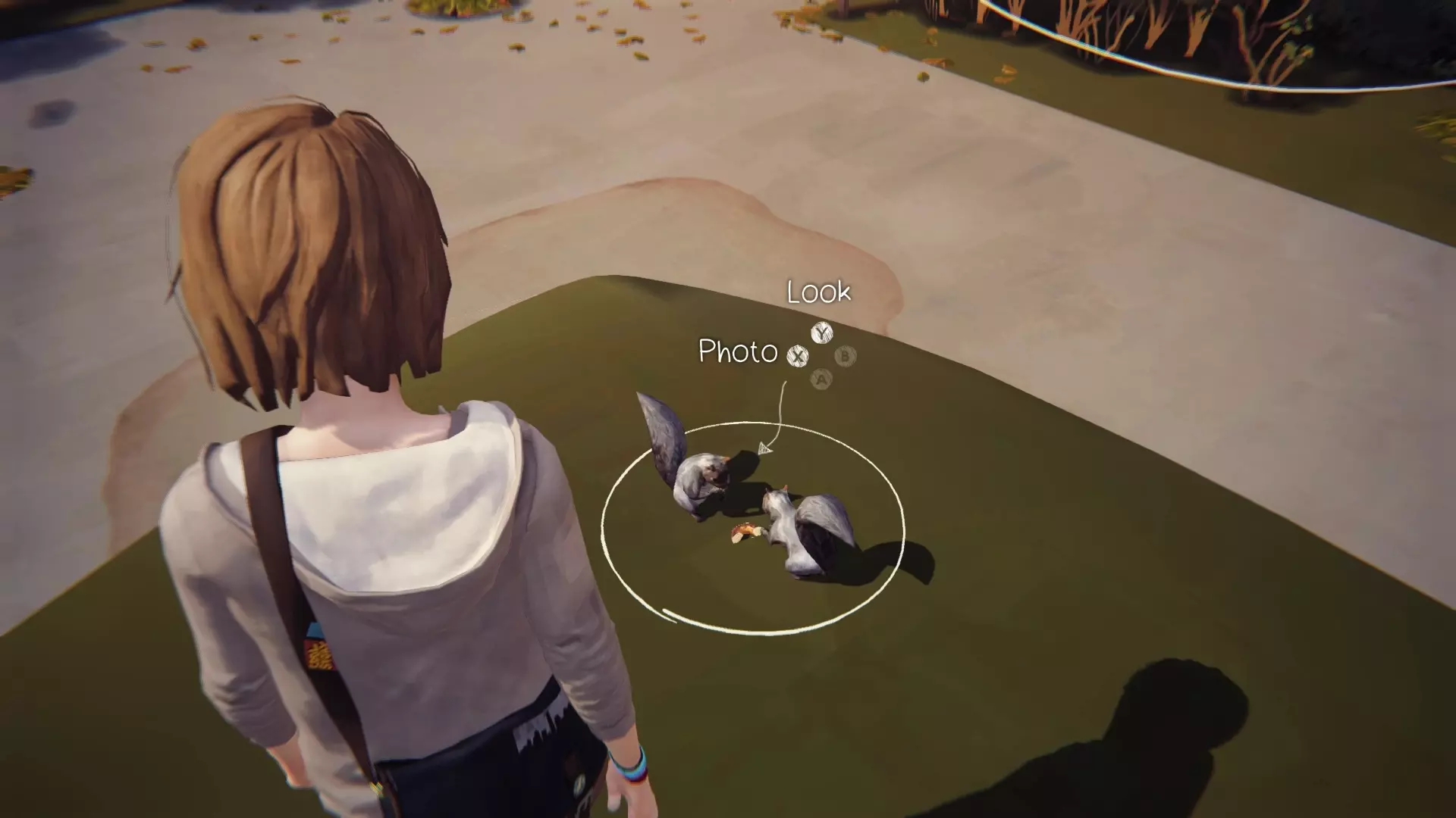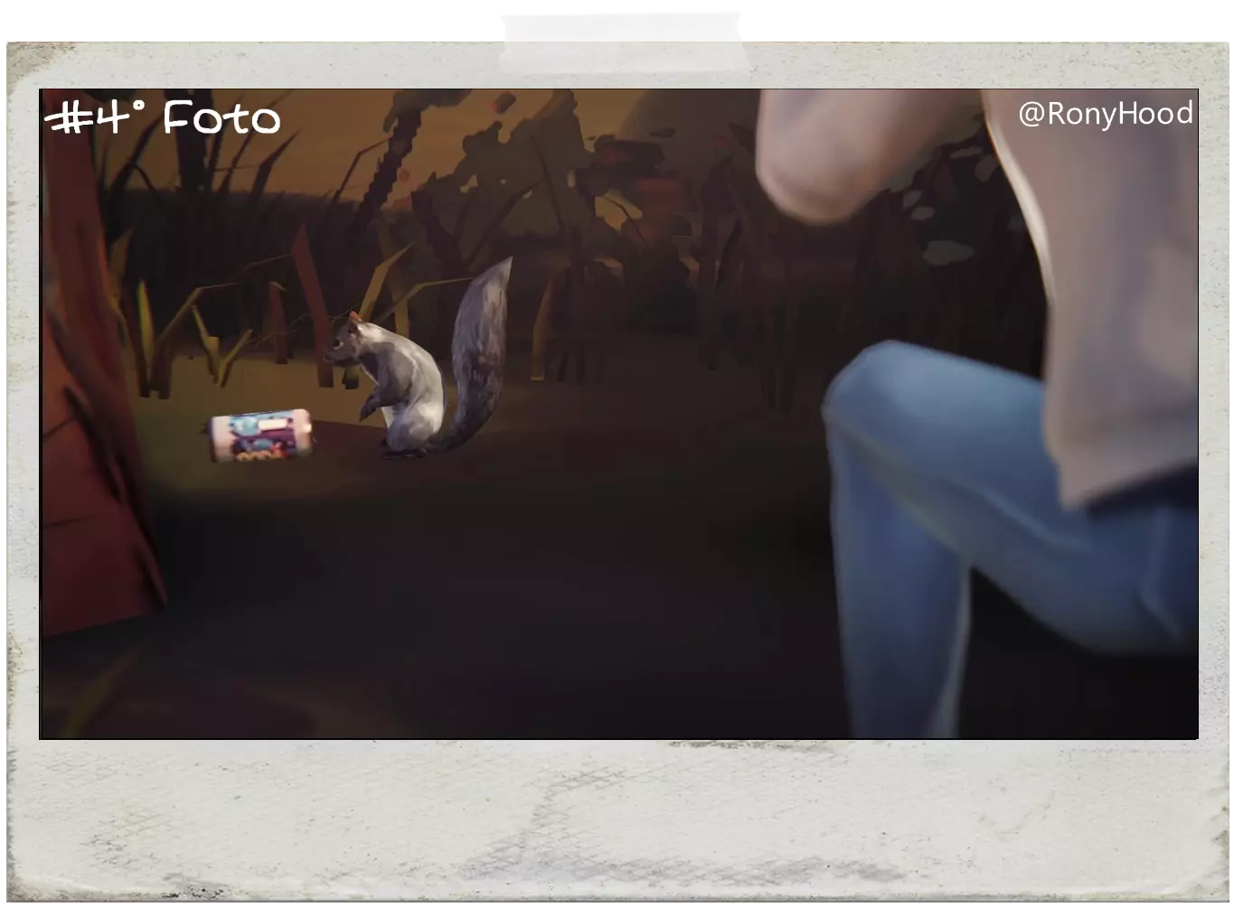 镜头制作EN:离开女生宿舍后,岸边附近会有一只松鼠,小心靠近并给它拍照,如果它逃跑了,就倒回时间重新拍摄。 PT:离开女生宿舍后,长椅附近会有一只松鼠,小心靠近它拍照,若它逃跑,倒回时间即可拍到。