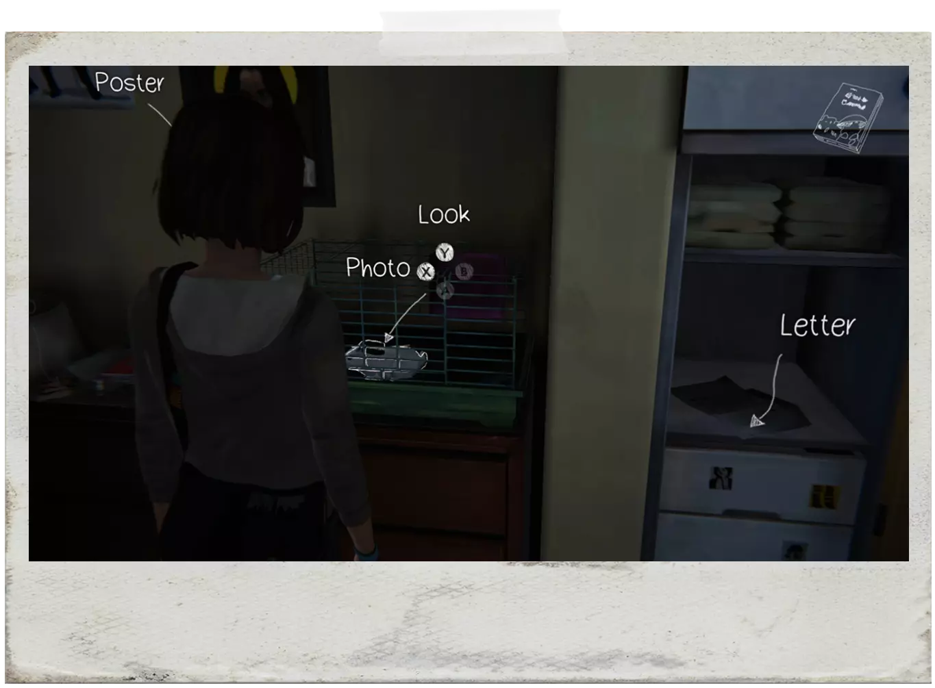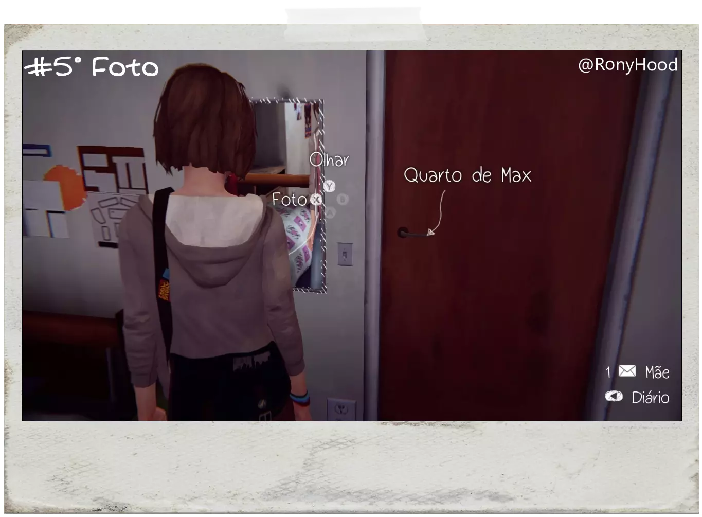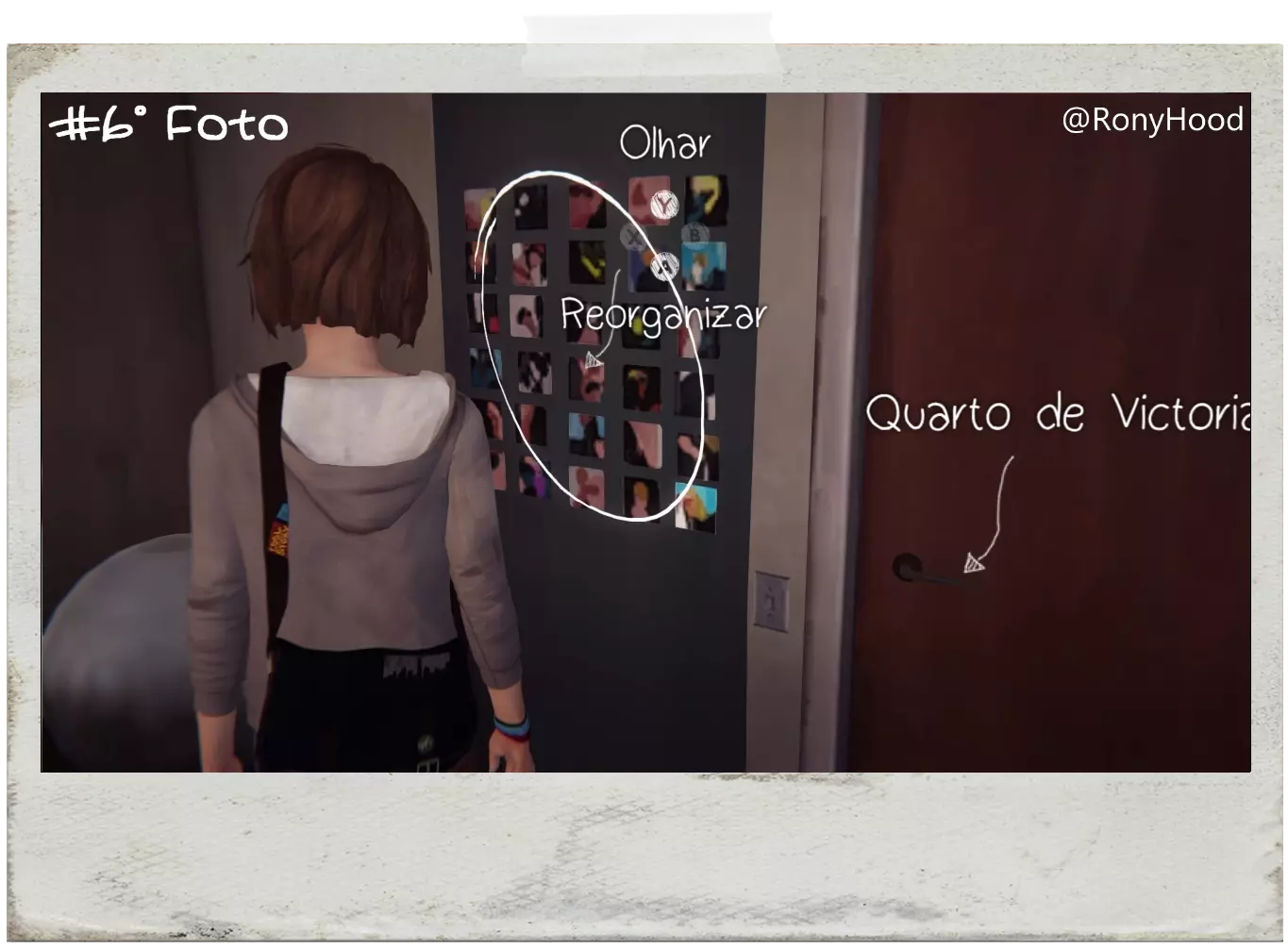 EN:在麦克斯和朱丽叶交谈后,你将能够拍摄这张照片。进入房间后,门附近的墙上会有几张照片,选择“弄乱”(MESS UP)来重新排列它们,然后拍照。 PT:这张照片只能在麦克斯和朱丽叶交谈后拍摄。当你进入维多利亚的房间时,门附近的墙上会有很多照片,然后选择“弄乱”(MESS UP,X键)来重新排列它们,接着拍照。