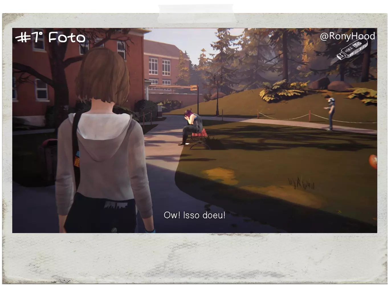 拉近镜头 英文:当你离开宿舍时,一个球会砸到艾莉莎。回溯时间,与她交谈并选择“警告”选项,她会躲开,球会打破窗户,现在只需给窗户拍张照。 葡萄牙文:当你离开宿舍时,一个球会砸到艾莉莎。回溯时间,与她交谈并选择“警告”选项(A键),这样她就会躲开,球会砸到窗户,然后只需给窗户拍张照。