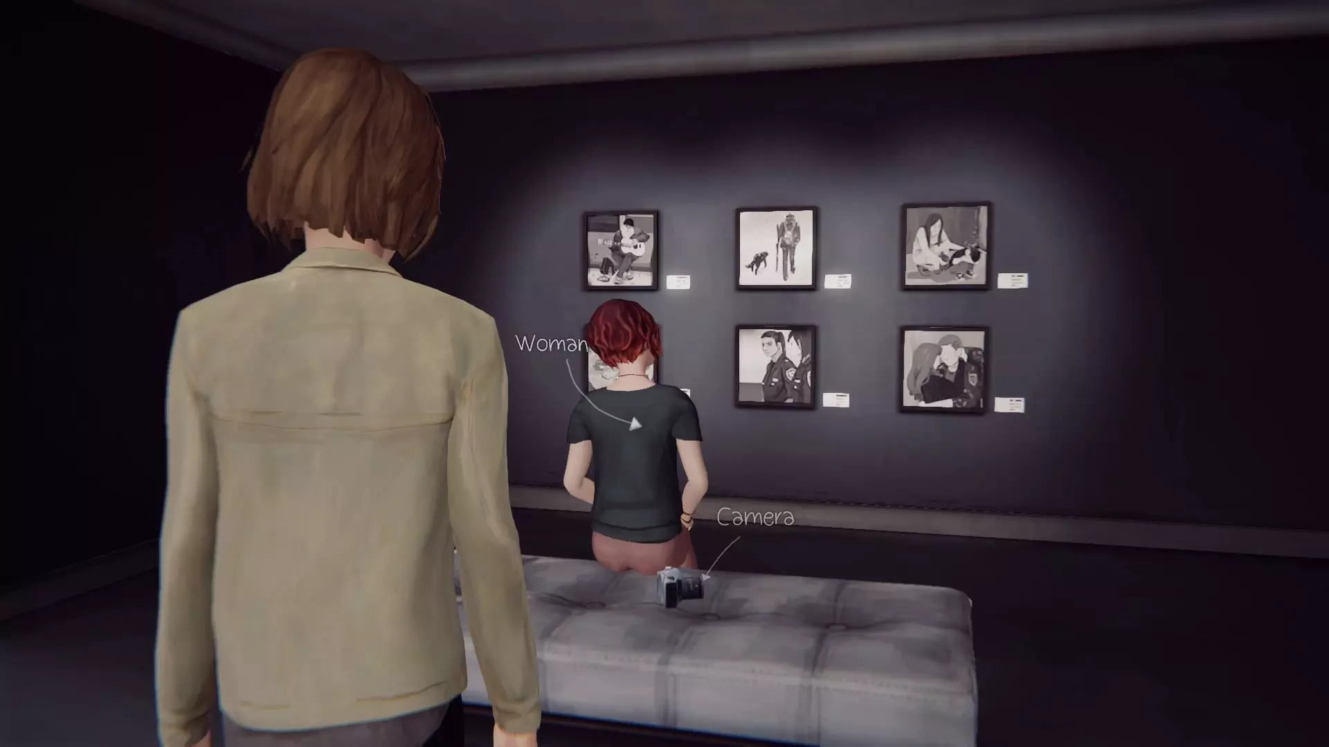 夜视仪 当你重新操控麦克斯时,向前走并向右转,直到看到一段楼梯。那里有一个女人正在看照片,她身后有一台相机。“借”走相机,从她身后给她拍张照。