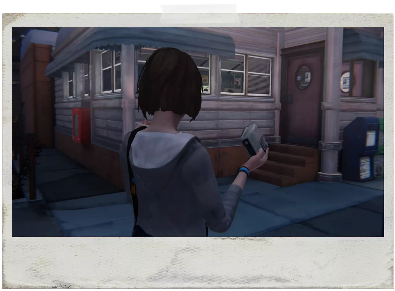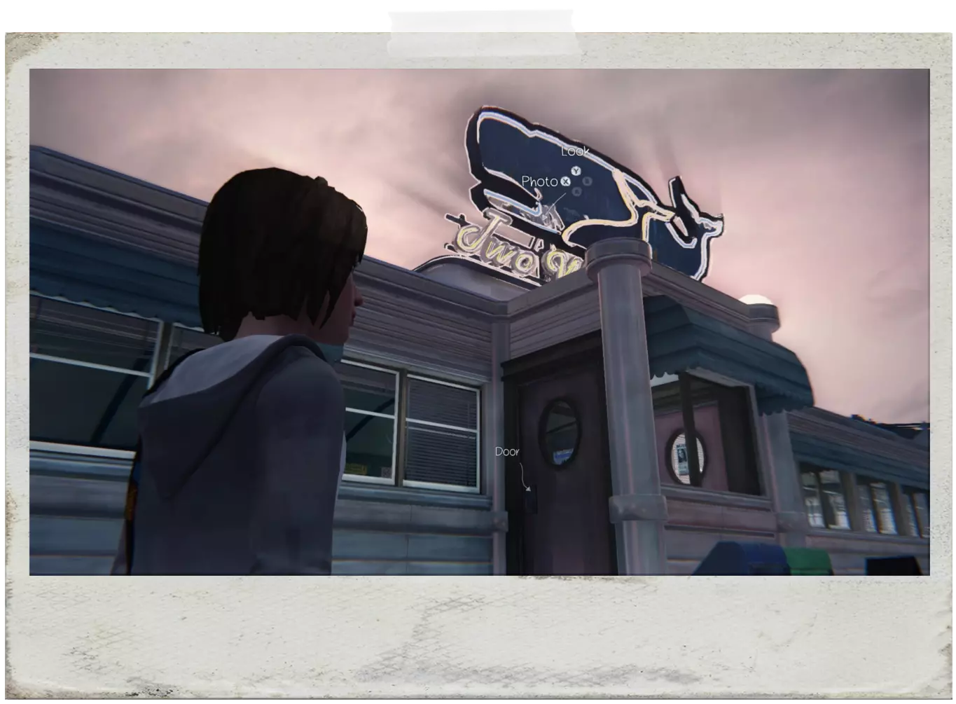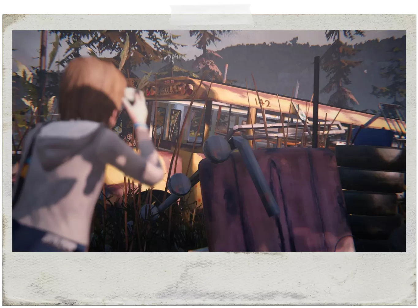PixelatedEN:离开酒吧,给校车拍张照。 PT:离开酒吧后,当和克洛伊在一起时,环顾四周会发现一辆停着的校车,调整位置以便能拍下它的照片。