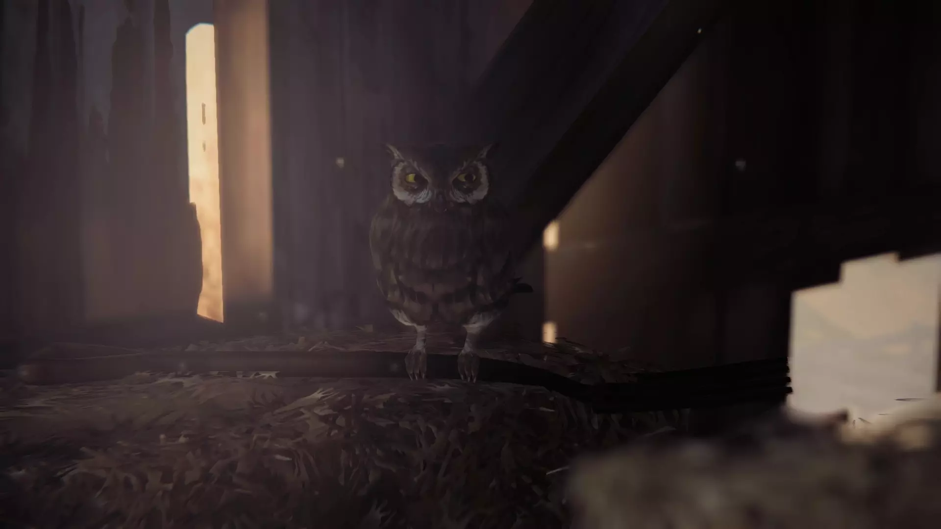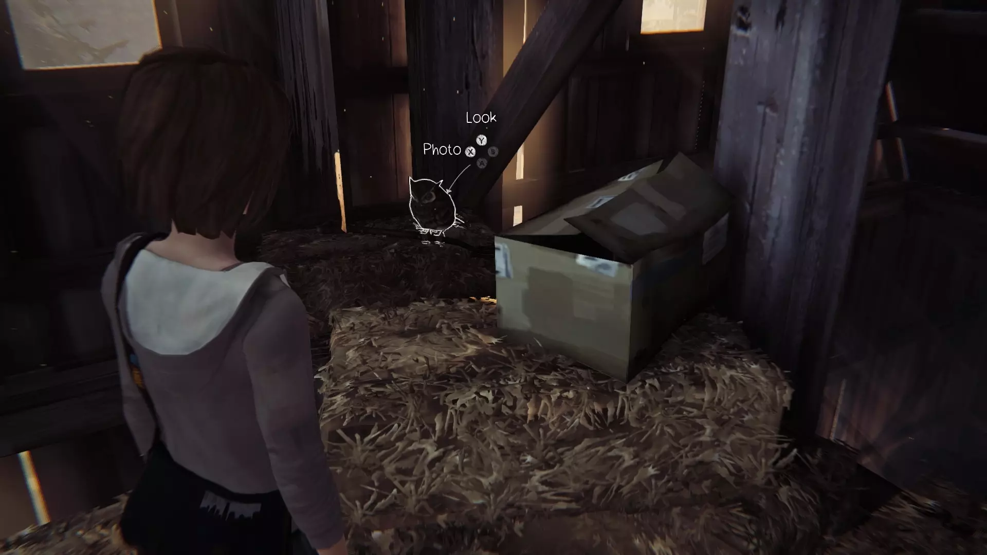 在谷仓内四处搜寻,找到一个活板门,尝试打开后会出现爬上顶层的选项。到达顶层后,往前走一点就能看到一只猫头鹰,靠近并拍照。