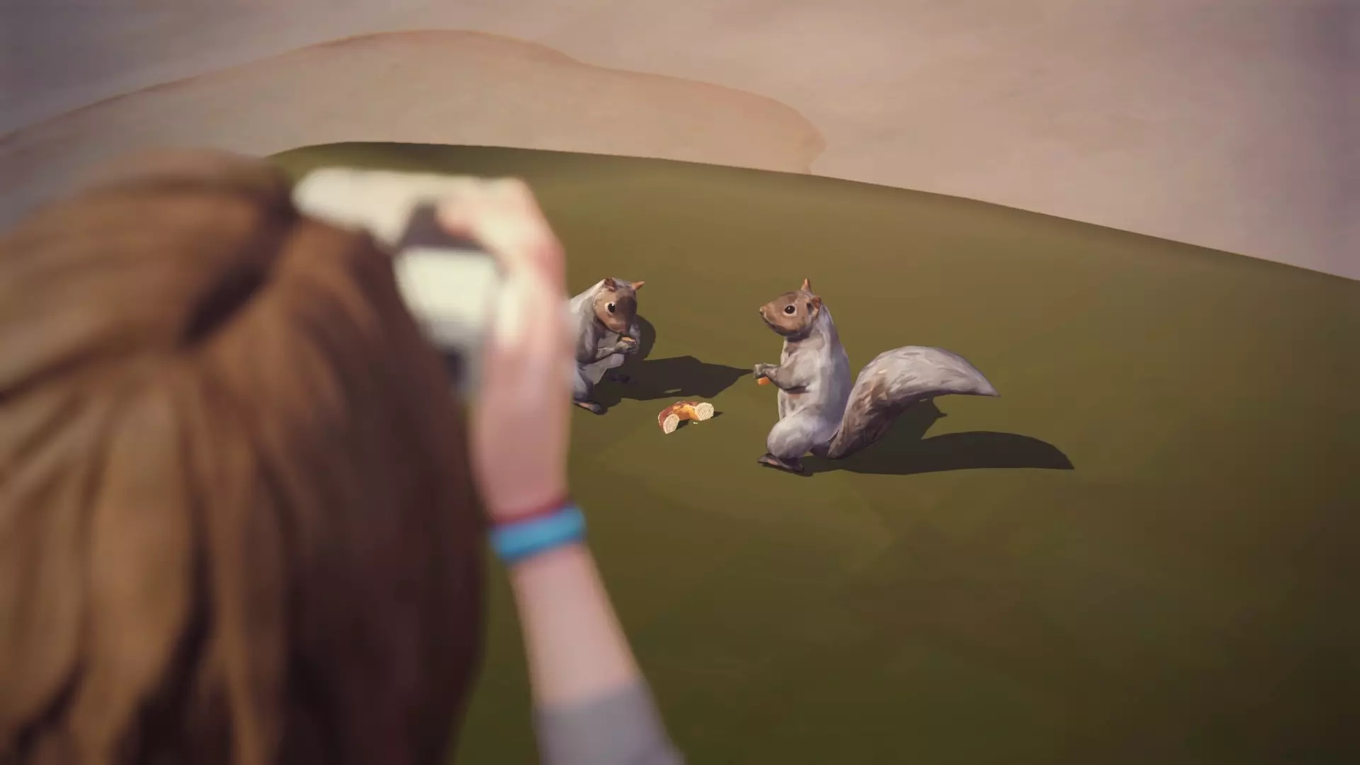 在宿舍外与塞缪尔交谈,谈论“动物”和“松鼠”,然后他会引诱一只松鼠。接着使用塞缪尔用过的相同食物引诱第二只松鼠。离开一段距离,当两只松鼠靠近时给它们拍照。