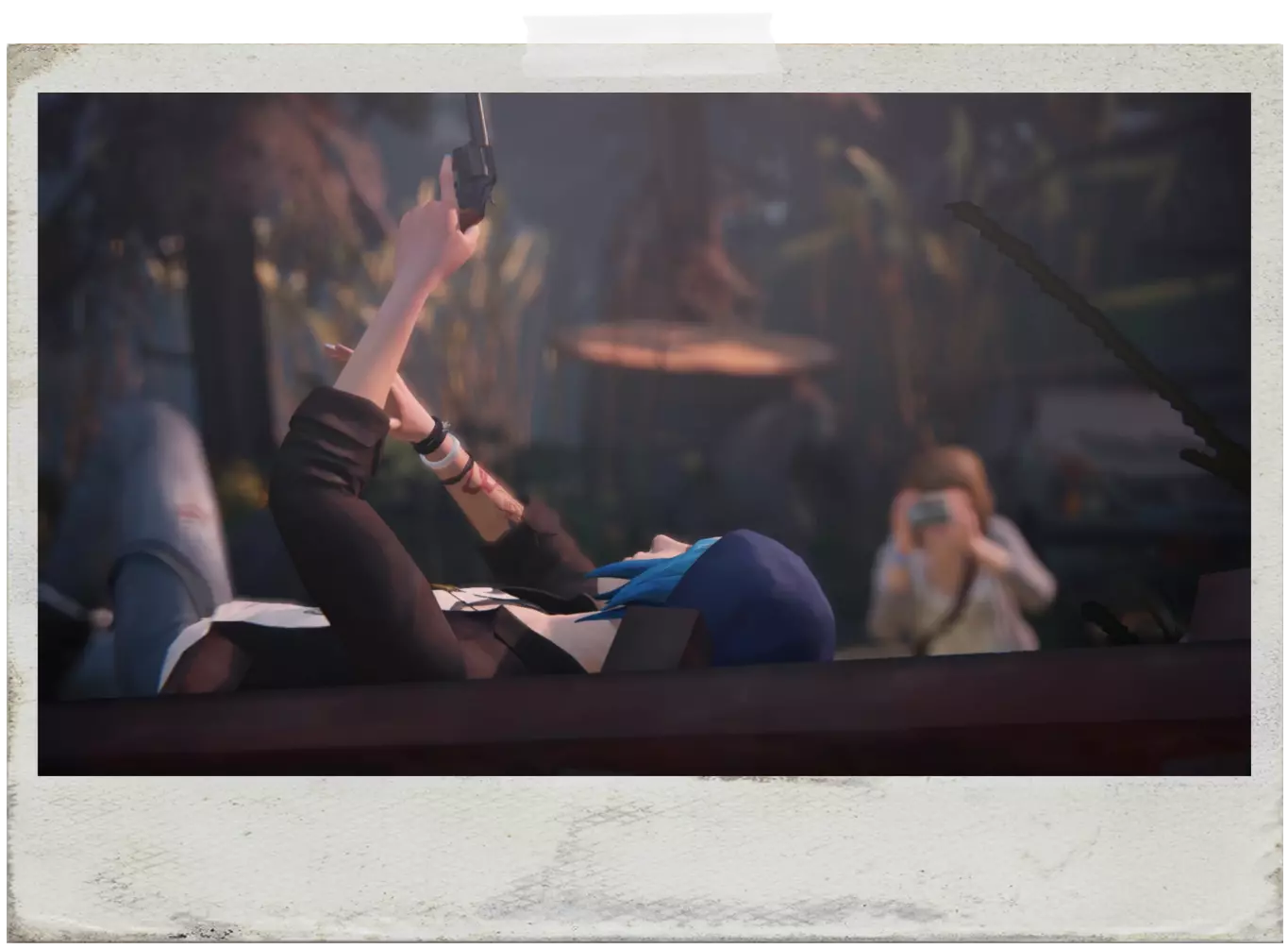 《Light LeakEN》:走向克洛伊,在与她交谈前靠近她,会出现与克洛伊和日落合影的选项。 提示:沿着灯塔走,你会看到克洛伊坐在前面的长椅上,在第一章的结尾部分,与她交谈前,从后面靠近她,直到出现拍照选项,然后拍摄克洛伊与日落的合影。