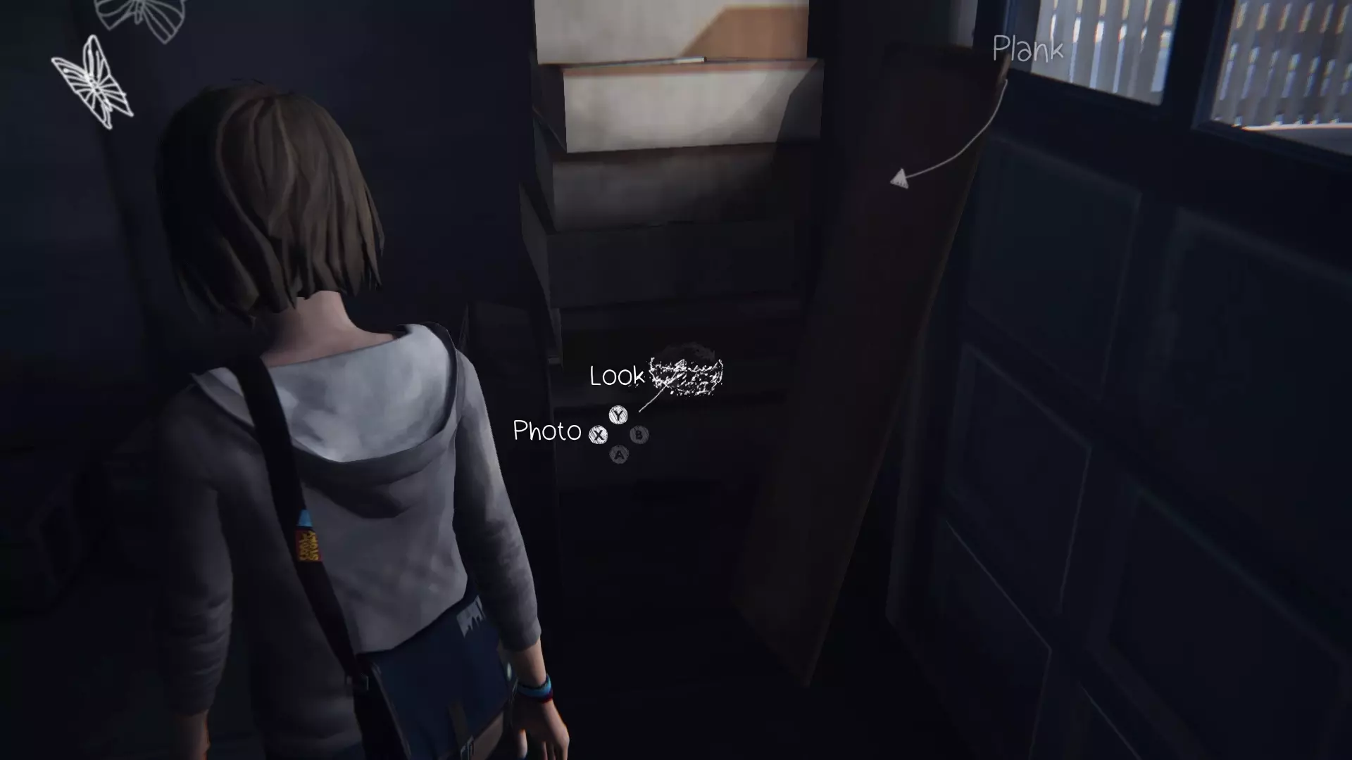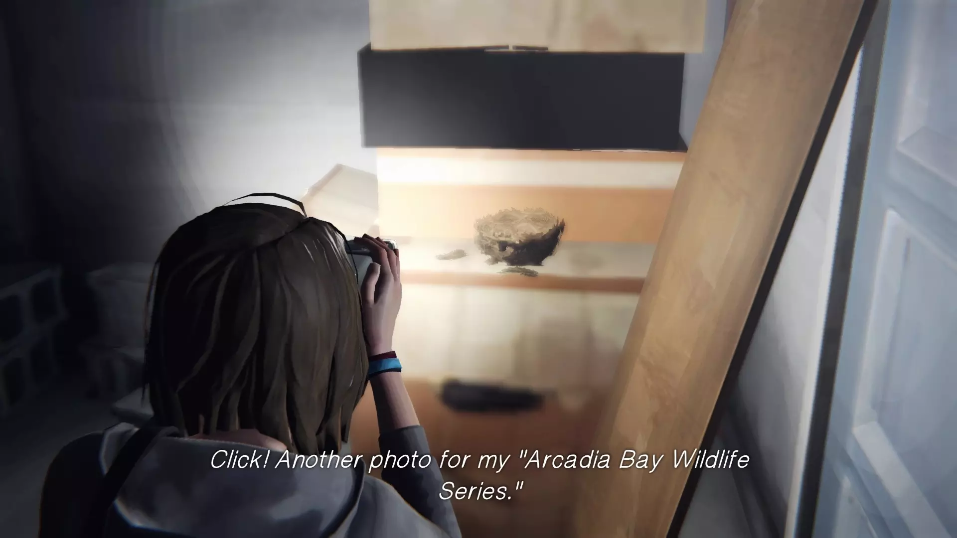 时间流逝:离开克洛伊的房间后,下楼前往车库,在大门附近会看到一块木板,移开木板并拍摄鸟巢的照片。