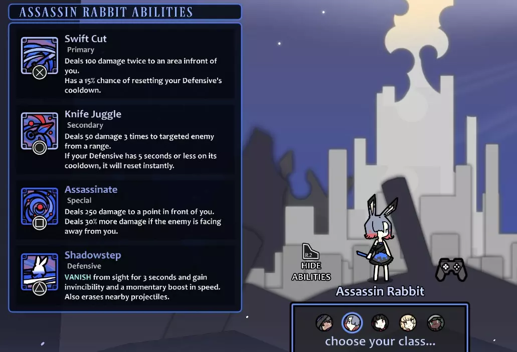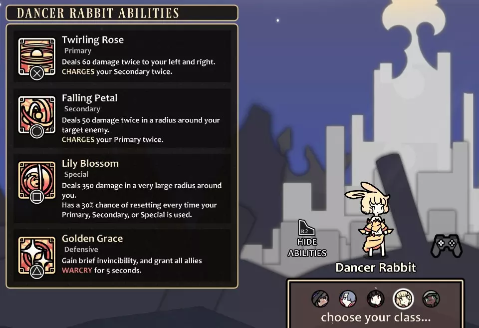 风格:以攻为守 技能循环:2→3→1→2→3→[1…];在技能3冷却时使用2→3→1 重刃兔或许是兔子家族中最基础的一员,它的存在就是为了攻击,没有什么花哨的技巧。说实话,你的技能循环并非至关重要;你只需一直猛按普通攻击键,直到某些情况迫使你离开攻击范围,这样也能应对得相当不错。在防御方面,你的暗影屏障不会直接影响伤害输出,这意味着你可以安全地积攒它,并在最佳时机随心使用——而那两秒的伤害免疫,是一个非常强大的能力,值得随时备在身上。结合旋转跳跃拥有短暂的无敌窗口,你就能获得一只操作简单、生存能力强,有时甚至会让人觉得有点不公平的兔子。唯一的真正缺点是她的每秒伤害(DPS)略低于平均水平,但当你如此难以被击败时,这真的重要吗? 选择物品时,优先考虑提升主要技能和特殊技能的道具,尤其是前者。你的次要技能伤害低得可怜,可以放心忽略,转而全力提升其他技能的数值。与其他兔子相比,你对移动速度的需求没那么高,因为暗影屏障实在是太强了;虽然提升移动速度也没坏处,但让其他兔子优先选择吧,它们可能更需要。 舞者