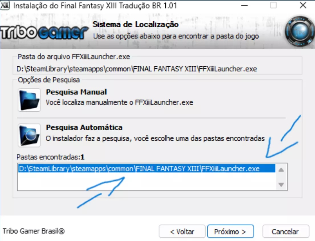 注意:图片中我使用的目录来自另一个游戏,但操作步骤是相同的。 使用Winrar程序解压文件,解压密码为:centraldetraducoes.net.br 继续操作直至出现游戏路径未找到的提示,点击确定,然后选择自动搜索。扫描完成后,游戏目录将显示在“找到的文件夹”中(如上图所示),点击该目录,然后点击下一步。现在等待完成,这可能需要大约15到20分钟。完成后,浏览器会打开Tribo game网站,只需关闭即可。