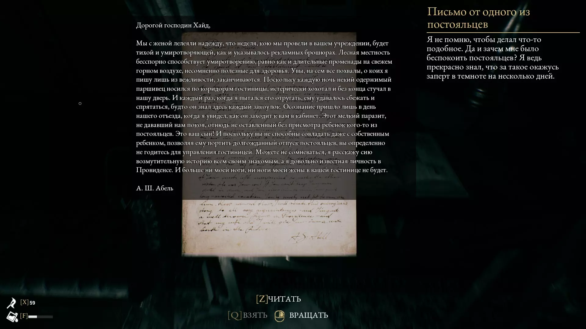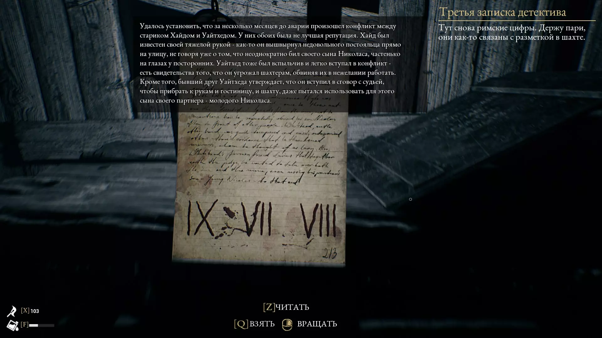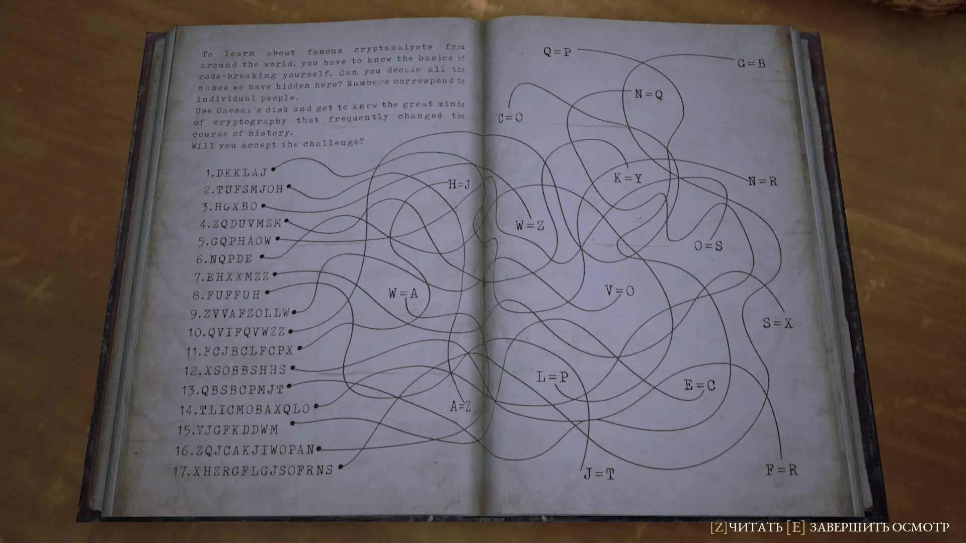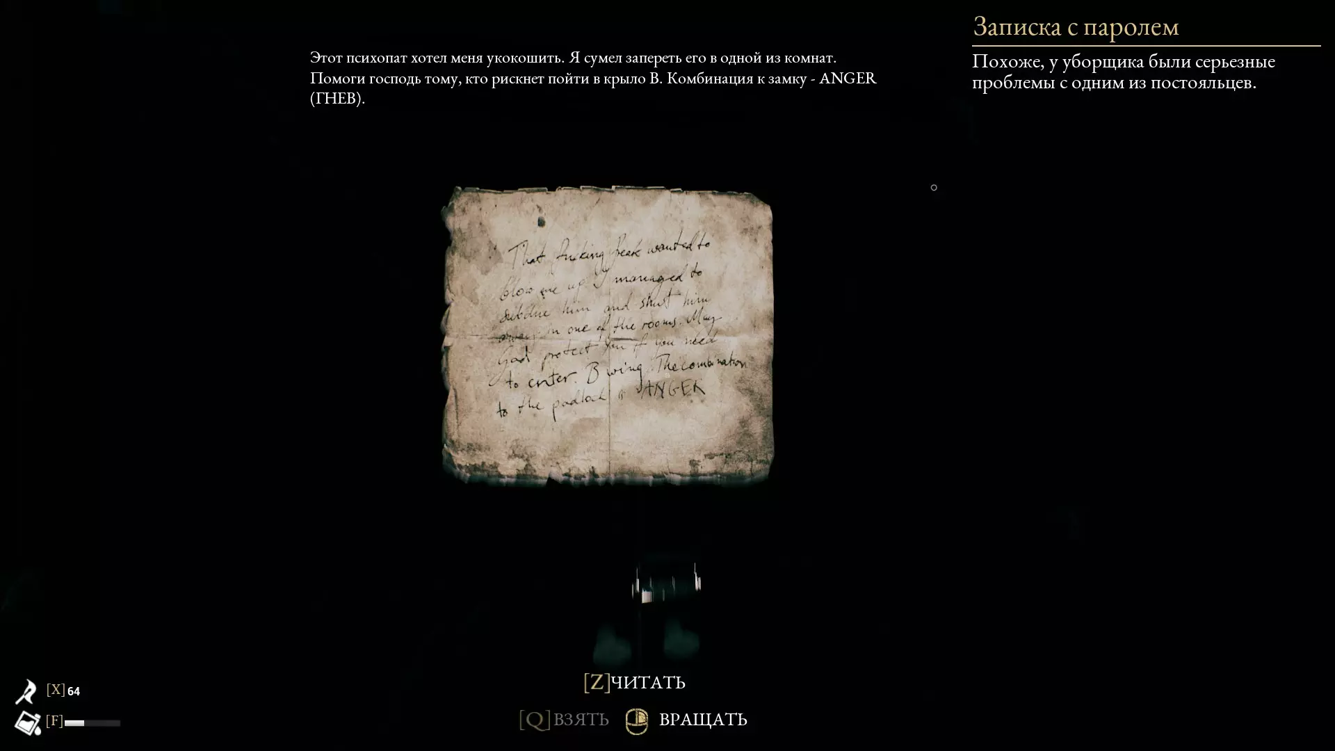 1) DKKLAJ - N=R - HOOPEN 2) TUFSMJOH - A=Z - STERLING 3) HGXBO - W=Z - KJAER 4) ZQDUVMZM - K=Y - NERIJANA 5) GQPHAOW - O=S - KUTLESA 6) NQPDE - L=P - RUTHI 7) EHXXMZZ - S=X - JMC CREE 8) FUFFUH - J=T - PEPPER 9) ZVVAFZOLLW - V=O - SOOTY SHEEP 10) QVIFQVWZZ - C=O - CHURCHILL 11) FCJBCLFCPX - H=J - HELDEN HERZ 12) XSOBBSHHS - F=R - JEANNETTE 13) QBSBCPMJT - Q=P - PARABOLIS 14) TLICMOBAXQLO - N=Q - WOLF PREDATOR 15) VJGFKDDWM - E=C - THE DIBBUK 16) ZQJCAKJIWOPAN - W=A - DUNGEON MASTER 17) XHZRGFLGJSOFRNS - G=B - SCUMBAG BENJAMIN 常见漏洞 说明 在向您展示这款出色游戏的精彩漏洞之前,我们需要说明一些细节和漏洞与游戏本身相关,而非特定章节……开始吧! 1.跳跃 我们指南中的大多数漏洞都需要通过“高跳”来实现(通常普通高度的跳跃是不够的!因此需要使用蹲跳)。实现方法 走到需要攀爬的位置,按住W键(前进),同时按下空格键(跳跃)+C键(蹲下) 这个操作相当困难,很多人一开始可能无法成功,但经过练习后可以做到零失误操作。 2.携带物品奔跑 在正常搬运重物时(任何需要按住鼠标左键(进行互动)来搬运的物品),角色会减速,这使得搬运物品(尤其是为了下一个漏洞需要搬运大量椅子时)变得非常麻烦,尤其是需要多次重复操作的时候!实现方案 为了加快这一缓慢的过程,需要:拿起物品并带着它向上走,因为我们需要“沉重坠落”动画,该动画会在从高处坠落时触发(例如:从房屋二楼的栏杆上坠落)。