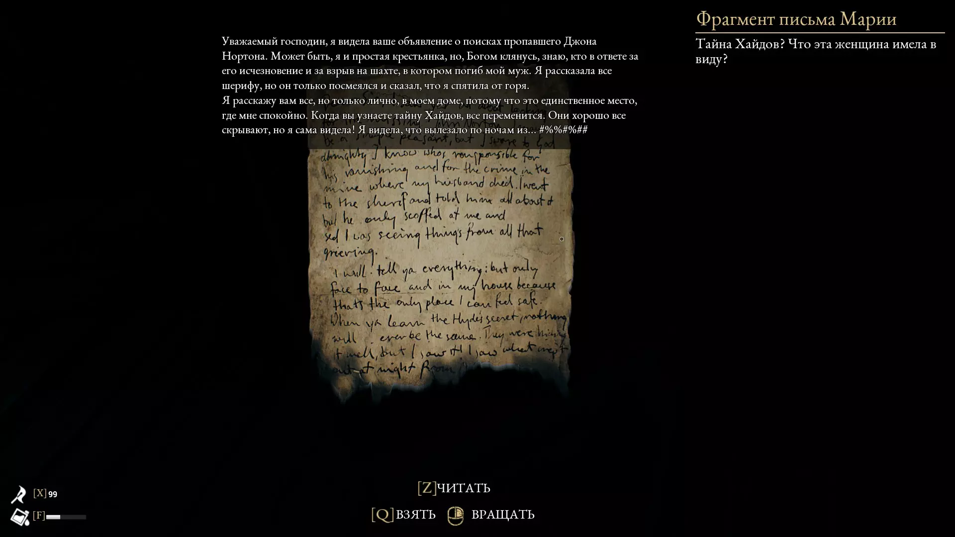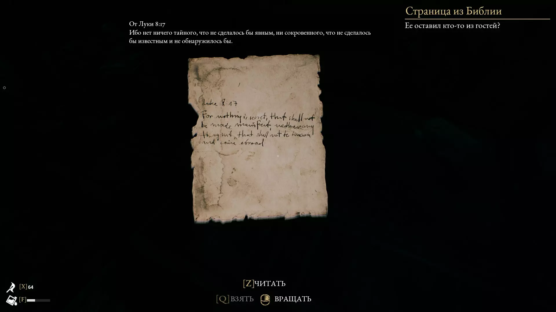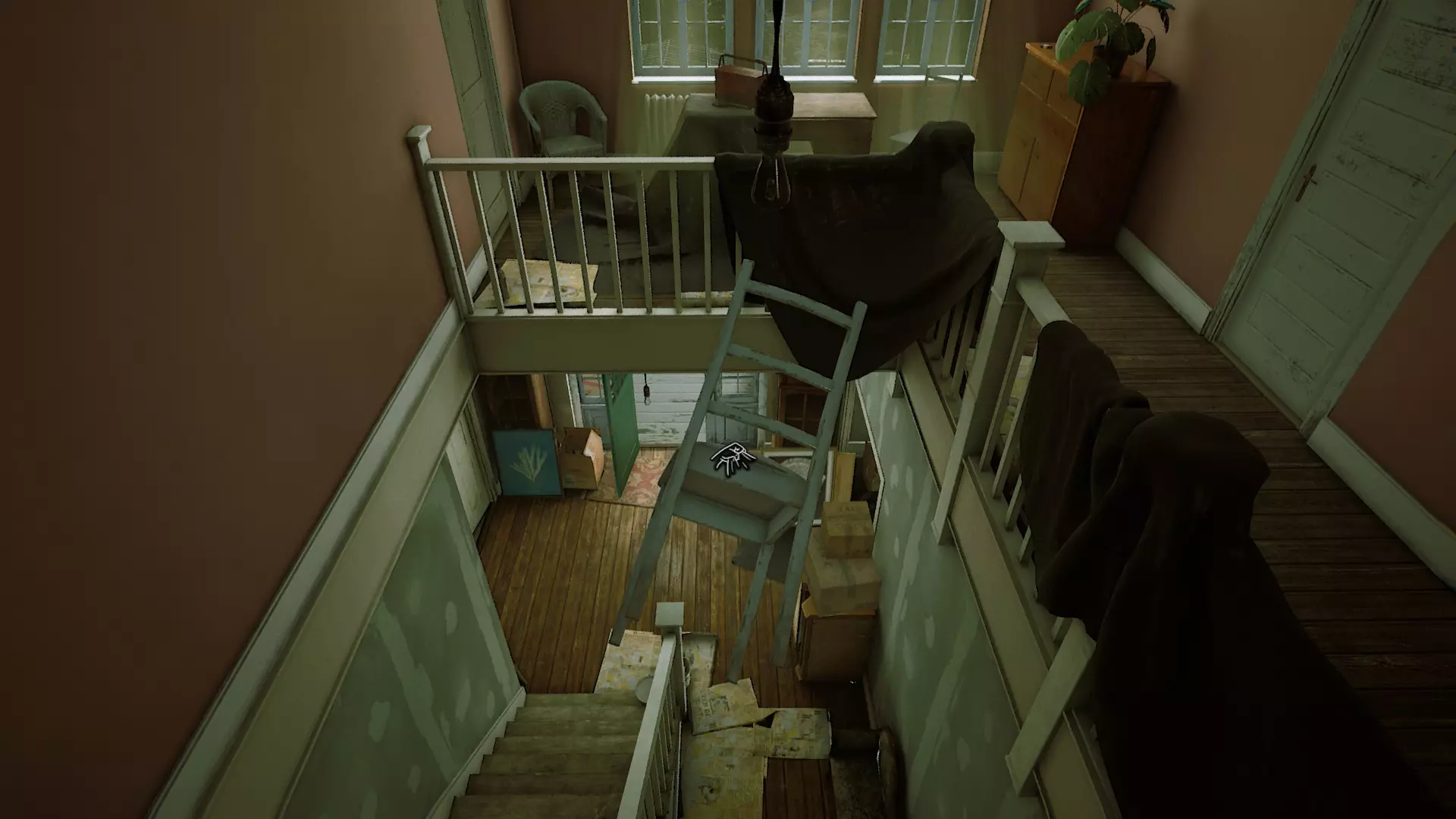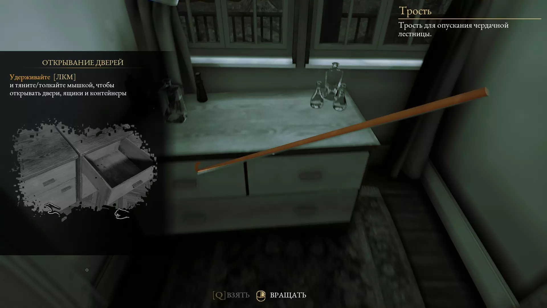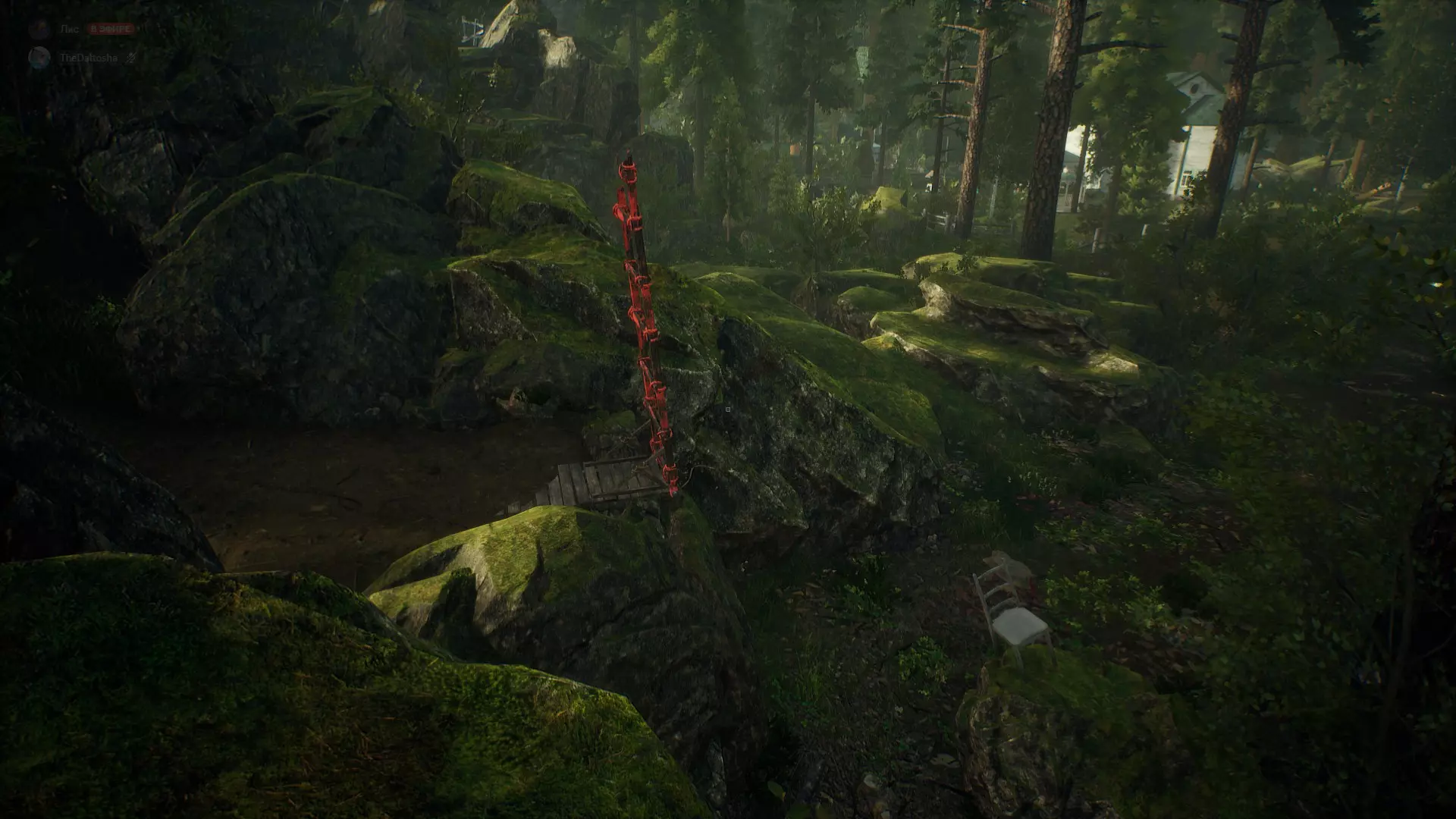 在获得“ТЯЖОЛОГО ПАДЕНИЯ”(沉重坠落)前,按住Shift键(奔跑)且千万不要松开物品。这样,你在携带物品时就能正常奔跑了!不过现在出现了一个问题,由于速度过快,你会被自己携带的物品挡住……但这可以通过侧向移动轻松解决!稍微将视角向右或向左偏转,让物品不会撞到你,而是在你旁边飞行,而不是在你前方……如果有什么地方解释得不清楚,或者您对某个漏洞的具体操作方法感兴趣,可以在评论中提问,或者直接联系指南的创建者(我们会告知您,必要时甚至会演示如何操作!) 1.漏洞 我建议从房子入口相对的地图左上角开始第一章A! 1.楼梯 通往谷仓的楼梯可以不用放下来,直接用椅子就行!(在本章中,这个地方被视为“未开放区域”,也就是说——玩家本不该到达这里,这意味着那里有很多有趣的东西!;))