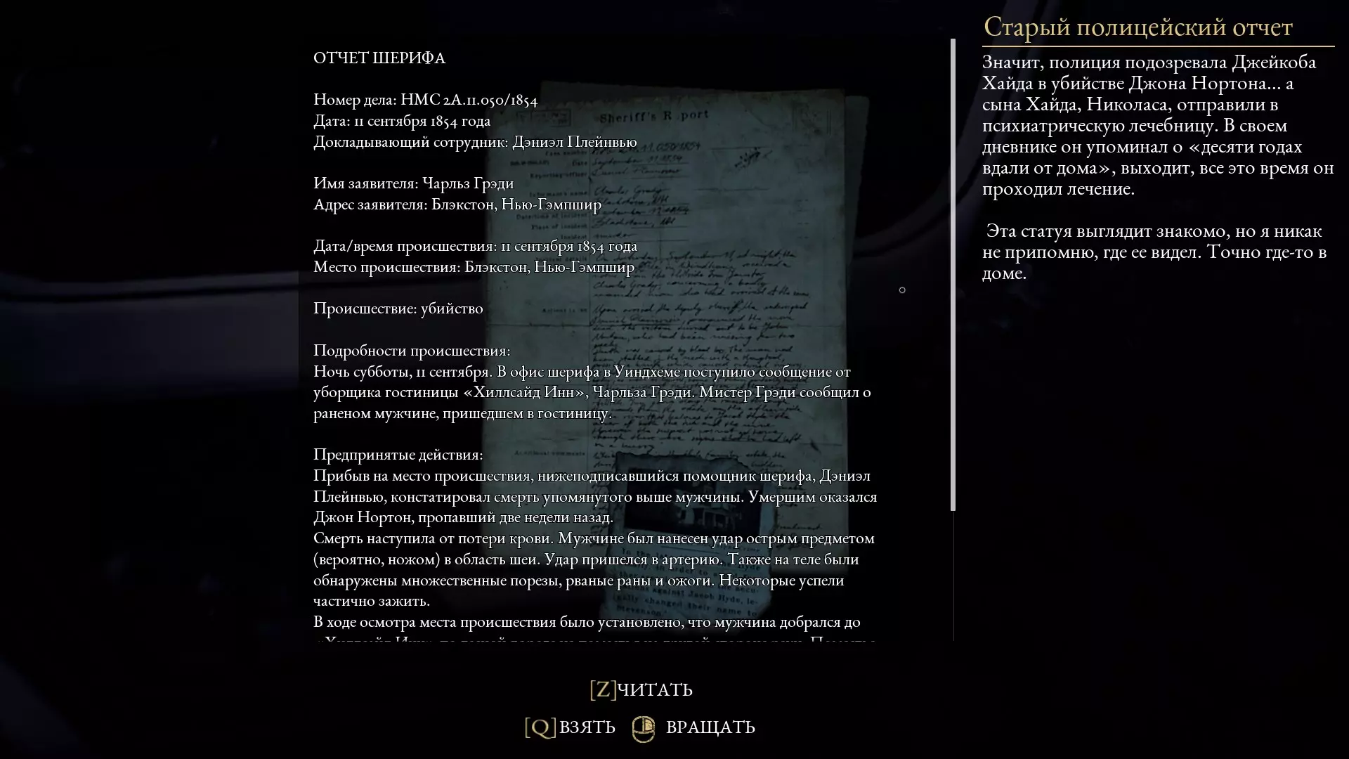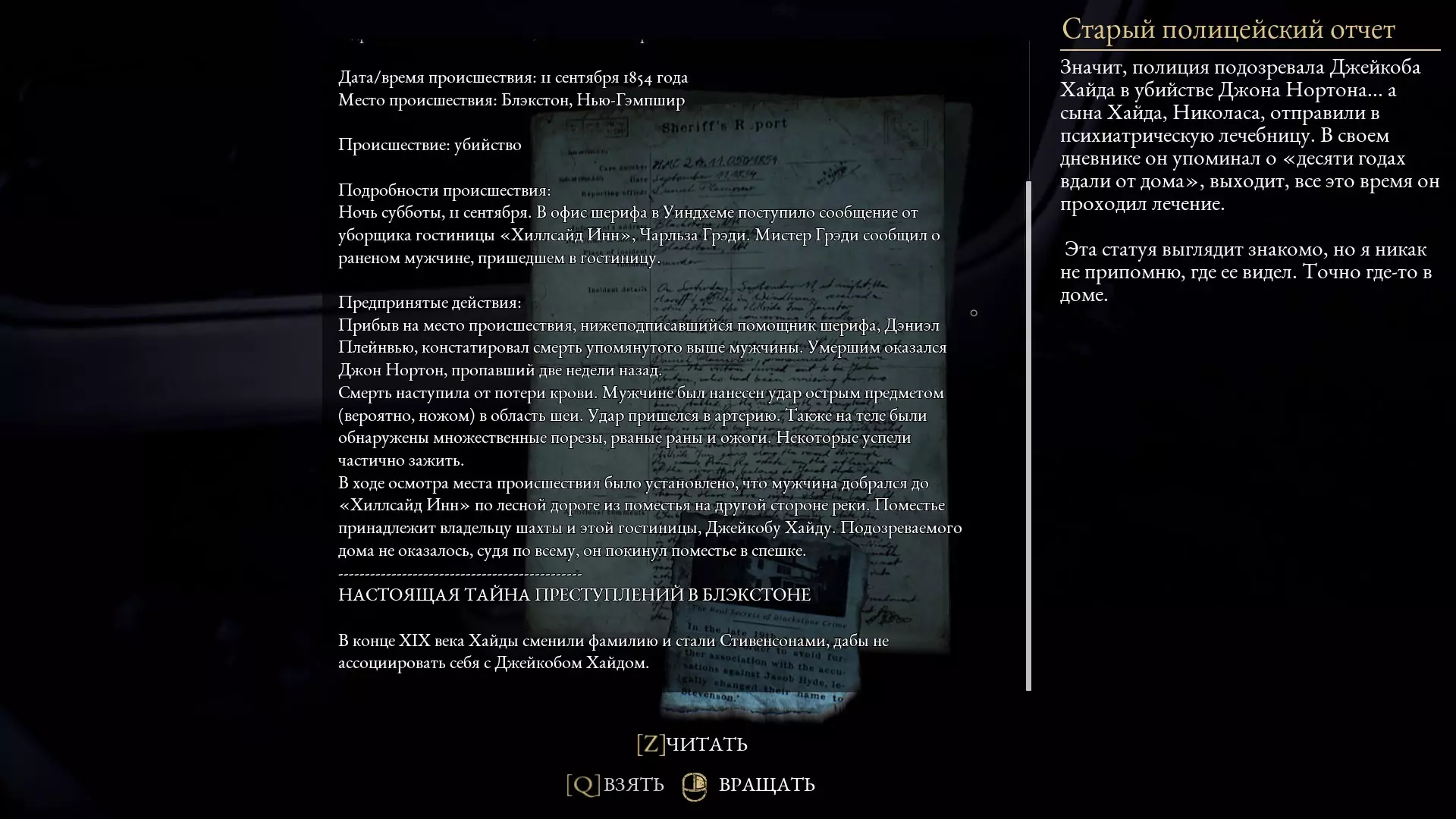 约翰·诺顿 年龄:62岁 职业:法官 年代背景:1864年,波士顿地区布莱克斯通 布莱克斯通的体面居民,海德家族的朋友以及尼古拉斯父亲的商业伙伴。许多人因其严厉而尊敬他,但更多人则因他的腐败而对其进行批评。所有角色 为尼古拉斯·海德(主角);尼古拉斯的第二人格(野兽);雅各布·海德(尼古拉斯的父亲);约翰·诺顿(法官);玛丽亚·海斯(矿工遗孀);沃尔特·吉尔曼(侦探);乔治·怀特黑德(雅各布的商业伙伴);矿工幽灵;梅德琳·兰德里克斯(旅馆住客/受害者之一);查尔斯·格雷迪(旅馆清洁工);索尼娅·哈夫特(旅馆住客);詹姆斯·威尔克斯·布特(士兵);安东尼·威尔科克斯(曾致信雅各布的人)亨利·威尔科克斯(安东尼失踪的兄弟);A. Ш. 阿贝尔(旅馆住客); 丹尼尔·普莱恩维尤(警长); 亚当相关 亚当·史蒂文森(主角); 艾玛·史蒂文森(亚当的妻子); 哈罗德 - 苏联间谍; 大卫 - 亚当的上司; P.T. 安德森 - 警长; 安吉拉(警长的妻子); 杰里米(警长的儿子); D. 卡普格拉斯(撰写其中一张便条的人) 所有便条和评论均为亚当所留 第一章