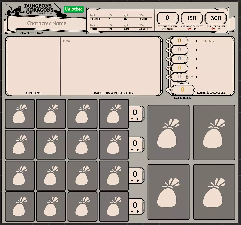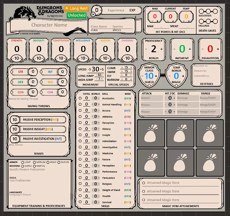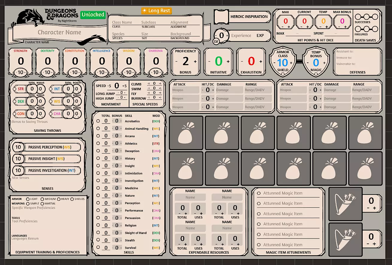 角色表 主要角色表 这是玩家最常查看的角色表,其中所有能力、技能等均为自动计算。 您可以通过点击“+”或“-”按钮增减所有数值。 点击项目符号可为技能添加熟练加值,再次点击可将其设为该技能的精通(添加双倍熟练加值),第三次点击则重置。 您可以点击增减或直接输入角色的最大生命值、当前生命值、临时生命值以及消耗性资源的数值。 点击“长休”按钮会将当前生命值设为最大生命值,消耗性资源也会重置为满值,临时生命值则设为零。 物品袋部分是物品卡的占位符。将物品卡片拖到槽位上,它会自动定位。此区域用于快速查阅物品,本质上类似于快捷栏。