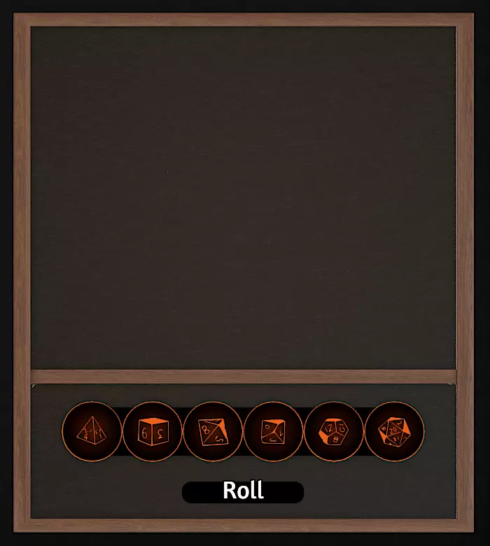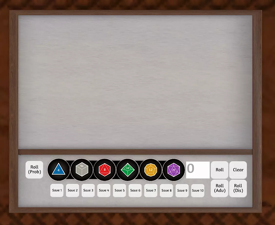 修正框:你可以在D20和“投掷”按钮之间的框中输入数字。该数字会在掷骰子后加到总和中。这用于为掷骰结果添加修正值,这在《龙与地下城》(D&D)中十分常见。 保存骰子:如果你想快速保存掷骰数量(例如为“火球术”掷8个D6),可以先生成想要保存的骰子数量,然后左键点击底部的某个保存槽位。每次按下该保存槽位,都会额外生成已保存数量的骰子。右键点击保存槽位可清除该保存。 投掷百分比/概率骰子:无需投掷百分骰,你可以点击“投掷(概率)”按钮来显示随机百分比。按下此按钮后,所有人都能看到结果。优势/劣势掷骰:当你按下“掷骰(优势)”或“掷骰(劣势)”按钮时,掷骰器会显示所掷骰子中的最高(优势)或最低(劣势)点数。这些按钮通常用于投掷两个D20进行优势或劣势判定。 DM专用掷骰器:此掷骰器仅向DM和按下按钮的玩家显示掷骰总数。若DM使用此掷骰器,则只有DM能看到结果。