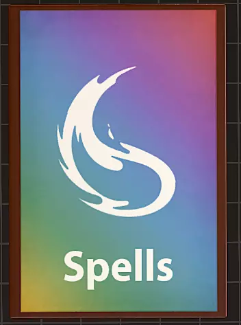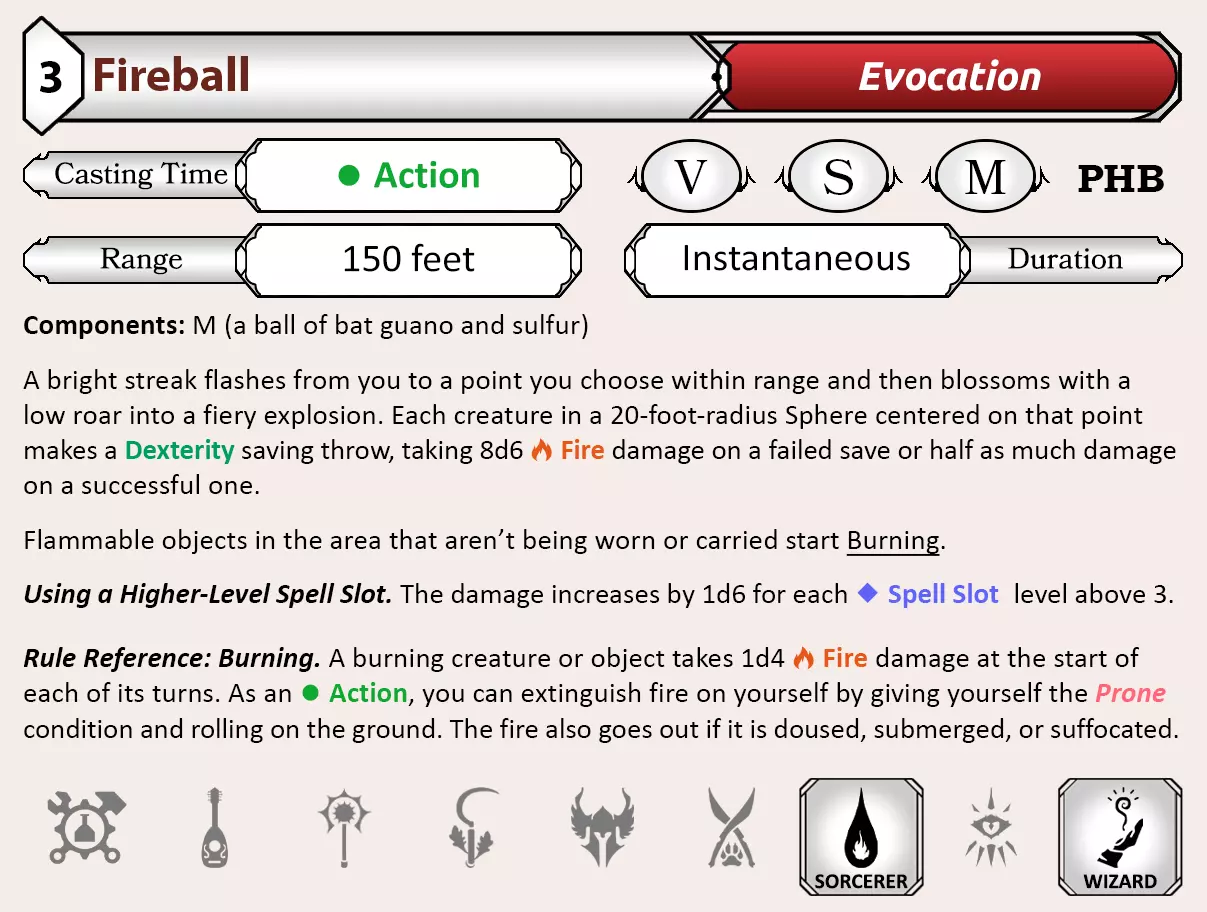 法术卡 为便于查阅,法术也以卡片形式呈现。每张法术卡包含以下信息: 施法时间,例如动作、附赠动作、1分钟等。 射程:可瞄准的最远距离。 持续时间:法术效果持续时长。 法术组件:言语(需念出咒语才能施法)、材料(所需材料)、姿势(手部动作)。 法术学派分类:防护系、咒法系、预言系、附魔系、塑能系、幻术系、死灵系或变化系。 初始可施展该法术的职业,任何职业、背景、专长或卡片若有特殊说明,也可能允许你施展该法术。