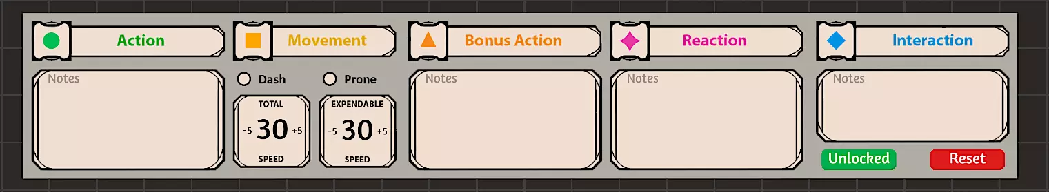 动作栏 动作栏用于帮助玩家在战斗中追踪可执行的操作。玩家获得的卡牌(无论是专长、法术、职业卡牌等)上会标注一个符号,指示该特性可作为何种类型的动作使用。玩家可在对应图标下方写下该特性的名称。 轮到该玩家行动时,他们可以点击动作图标使其消失,这样就能清晰地知道在本回合中已使用了该动作。玩家可通过点击“重置”按钮或再次点击图标来恢复图标。请务必锁定动作栏,以防止玩家意外删除已写下的文本。