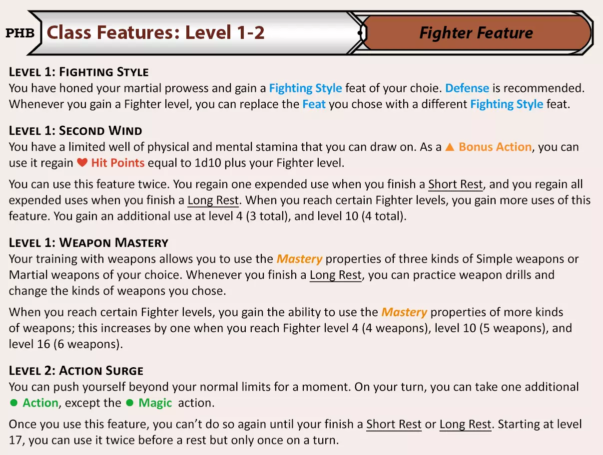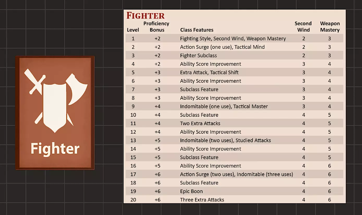 我们将以战士职业盒为例。每个职业盒内包含: 创建1级*职业 职业表格,显示各等级获得的内容 装备卡牌包 法术、武器精通、专长、特殊选项(若有) 子职业,每个职业在3级及以上可获得一个