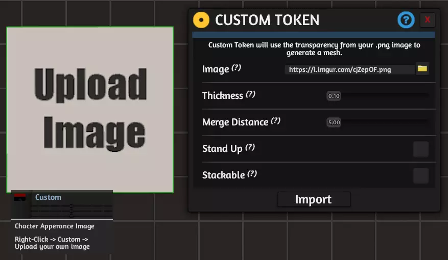 自定义图像:这是一个用于放置在角色清单表上的标记,用于显示玩家角色的图像。要更改图像,主机需右键点击该标记,选择“自定义”,然后粘贴图像URL,或点击文件夹图标浏览并导入所需图像。导入后点击“云端”,确保所有玩家都能看到该图像。