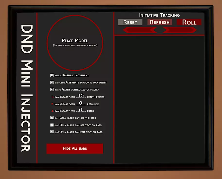 DND 迷你注入器 DND 迷你注入器是一款用于在战斗中帮助追踪模型的先攻权、生命值和移动情况的工具。下面我将尝试对其工作原理进行简单说明,如果你需要更深入的指南,请查看 ColColonClearn 的原始模组和/或下方的视频教程。 https://steamcommunity.com/sharedfiles/filedetails/?id=2454472719&searchtext=dnd+mini+injector https://www.youtube.com/watch?v=GWwq8VGAHL0 为战斗准备模型 当你准备好玩家和生物的模型后,就可以为战斗开始进行设置了。将任意模型拖到 DM 侧的 DND 迷你注入器上。只有 DM 可以看到并与注入器工具上的文本进行交互。
