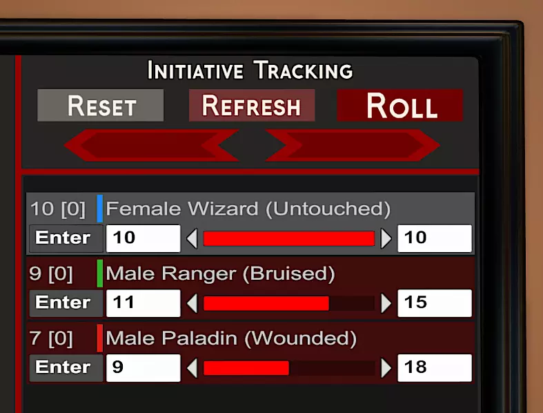 栏按钮 栏编辑按钮。勾选“栏编辑按钮”后,可在栏的两侧显示“+”和“-”按钮。 低于零值和高于最大值。分别勾选这些选项后,可允许迷你单位的数值条低于零值或高于其最大值。 隐藏数值条。勾选这些选项将关闭或开启生命值条以及另外两条分别为蓝色和黄色的数值条的界面显示。这些额外的数值条可用于追踪其他资源。它们下方的“最大值”部分用于修改对应数值条的最大数值。 先攻 迷你单位会自动进行先攻判定。勾选“先攻包含”选项后,当点击注入器的“投掷”按钮时,该迷你单位将被加入先攻序列。 “先攻调整值”是在进行先攻判定时添加到该迷你单位先攻值上的奖励数值。否则,若禁用掷骰,你可以在“先攻值”中手动输入先攻。每次先攻阶段结束后,“先攻值”将重置为100。 掷骰先攻 当你准备开始战斗时,点击“掷骰”按钮以启动先攻。这将为所有人(玩家和NPC)进行掷骰。若已注入数据,他们的生命值将显示在注入工具上,且每个玩家的屏幕右侧都会显示其先攻掷骰结果。